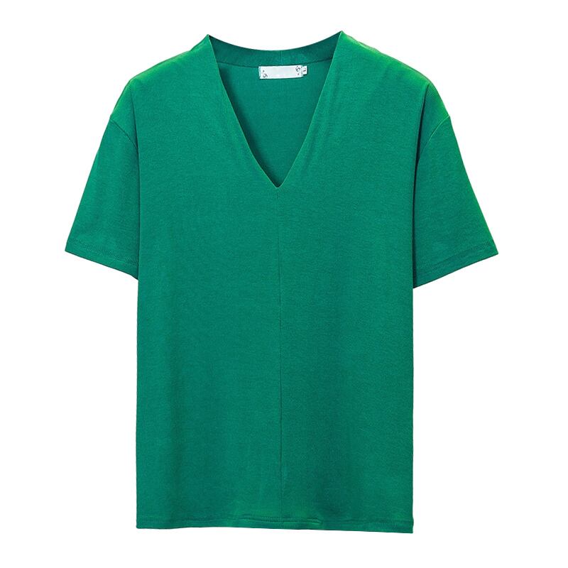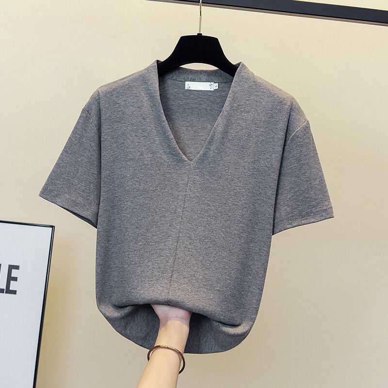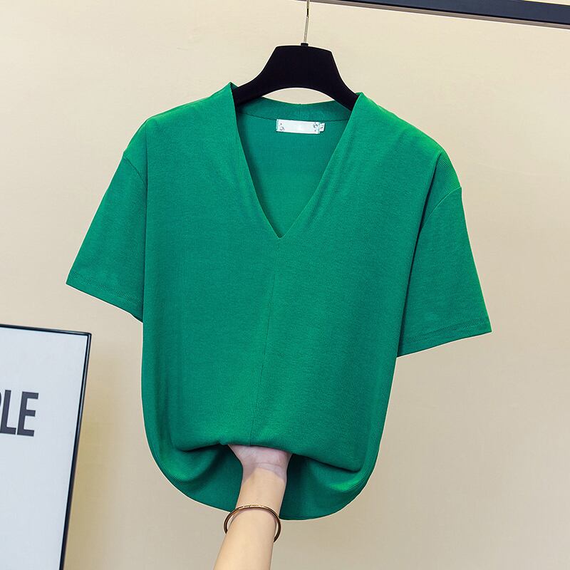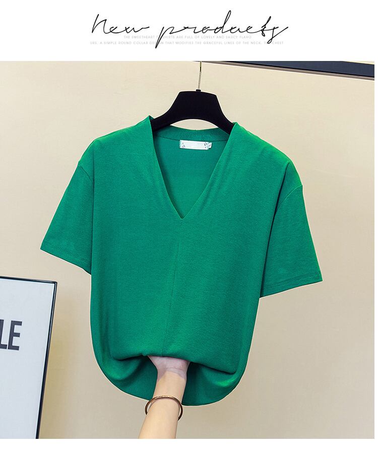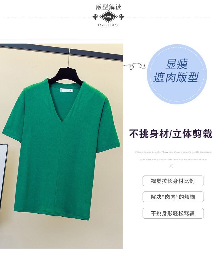 ラージサイズの婦人服2022年夏の新しいファットシスターエインスタイル無地Vネック半袖Tシャツファッションオールマッチベリーカバートップ 大きめサイズ サマー 夏物 ソリッドカラー 8884199159394408