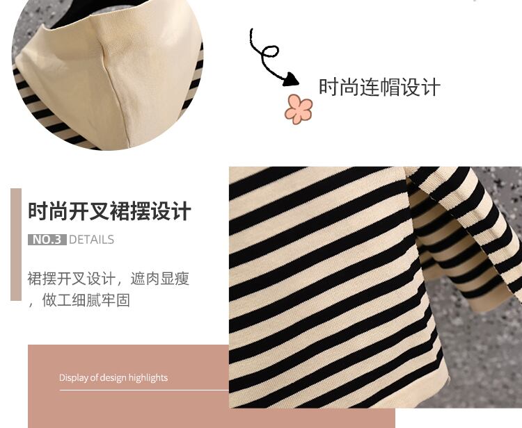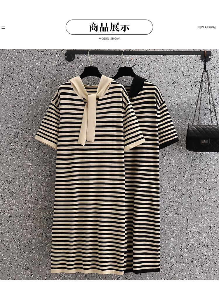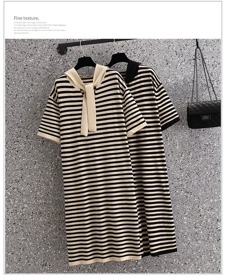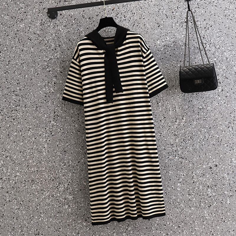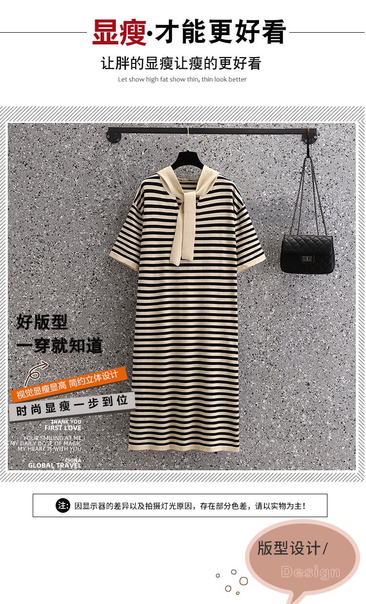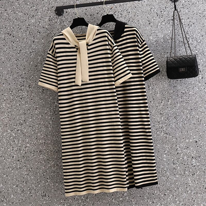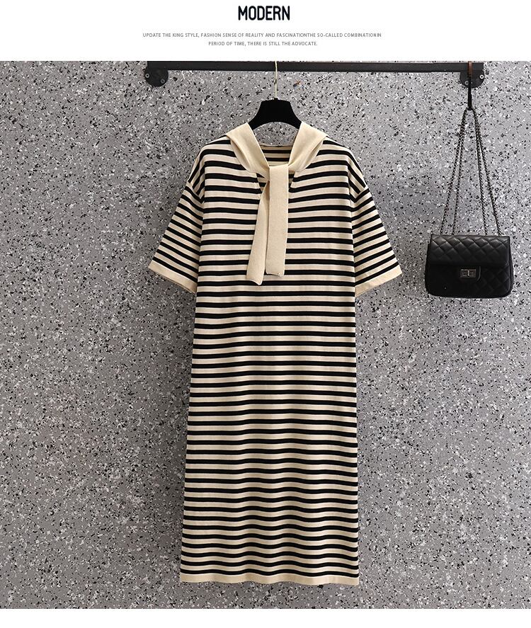 ラージサイズの婦人服2022年夏の新しい太った姉妹ストライプのルーズで薄いフード付きオールマッチ気質ニットドレス 大きめサイズ サマー 夏物 8884177309711275