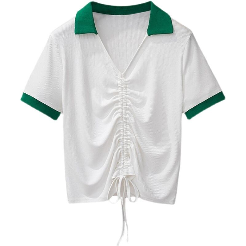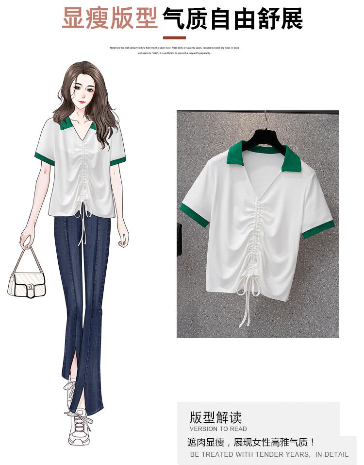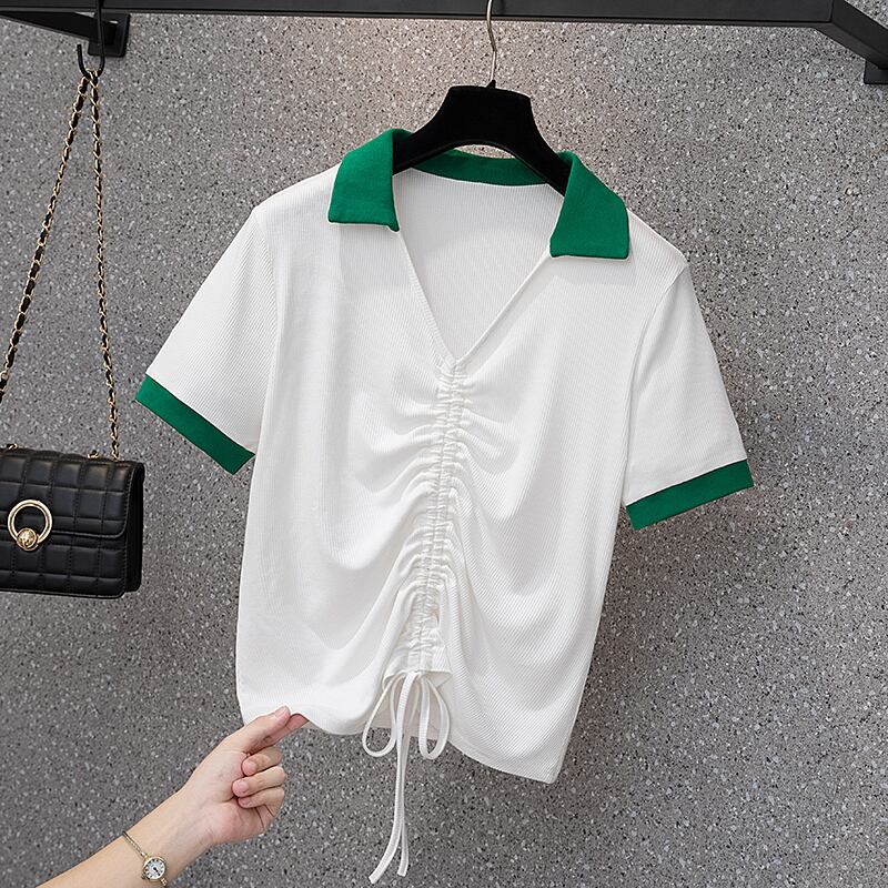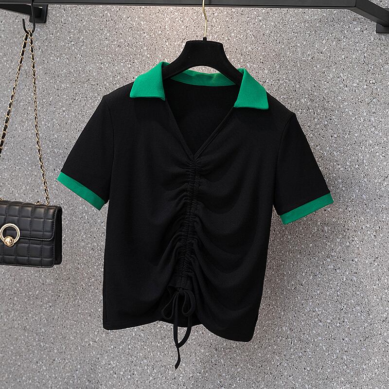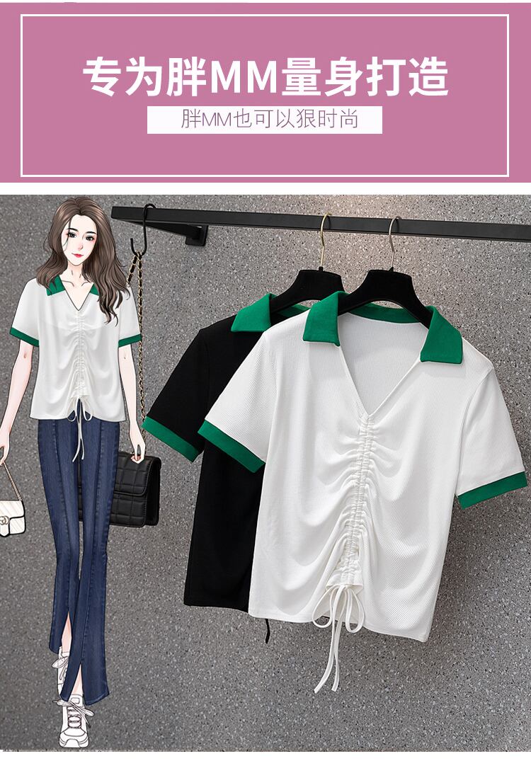 大きいサイズの婦人服2022年夏の新しい太った姉妹気質ラペル巾着ゆるくて痩せたカバー腹と年齢を減らすTシャツの女性 大きめサイズ サマー 夏物 8884192641023467