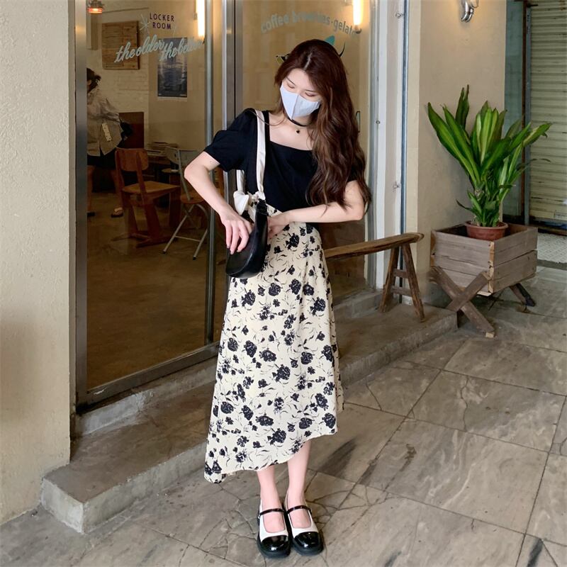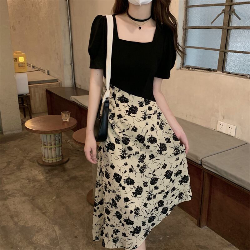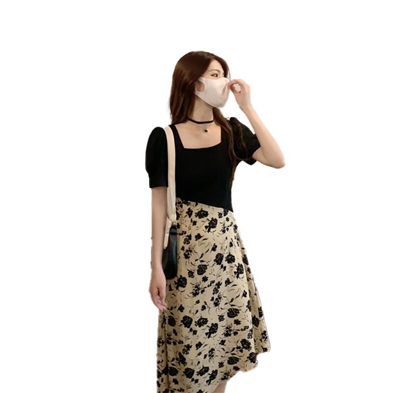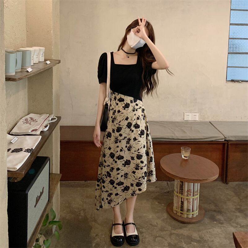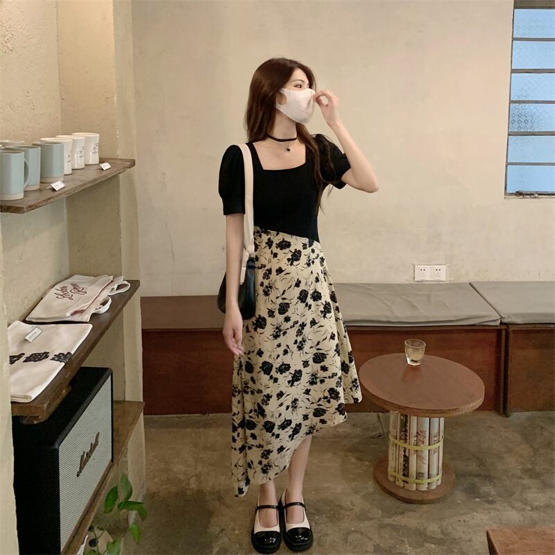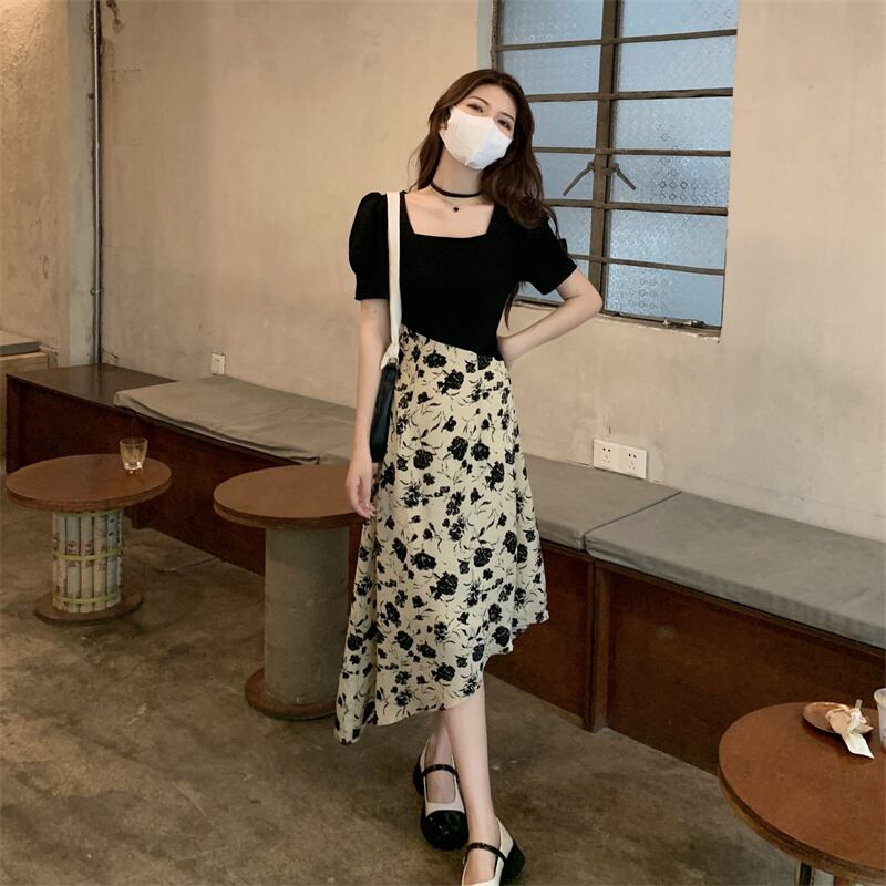 ラージサイズ婦人服2022ファットシスターサマーニューデザイン気質ロングスカートフローラルステッチフェイクツーピースドレス 大きめサイズ 夏物 花柄 8884168875194311