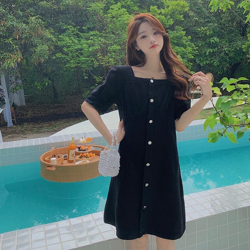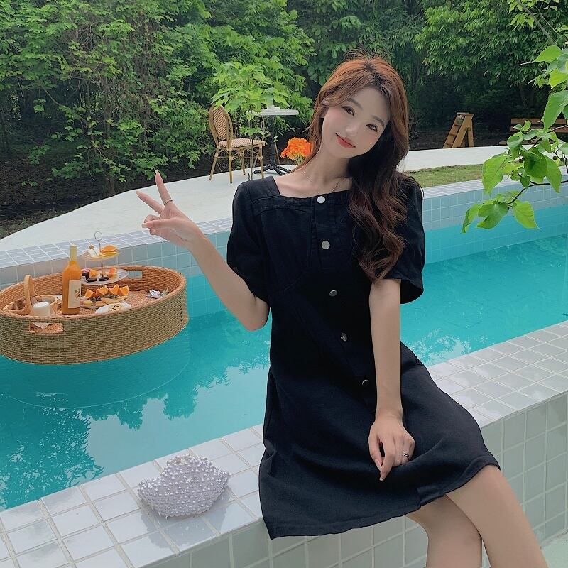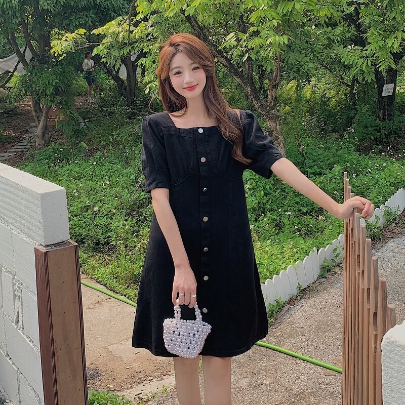 ラージサイズ婦人服2022ファットシスターサマーニューウエスタンスタイルウエストAラインスカートブラックデニムスクエアカラーワンピース 大きめサイズ 夏物 スクウェア 8884144725776747