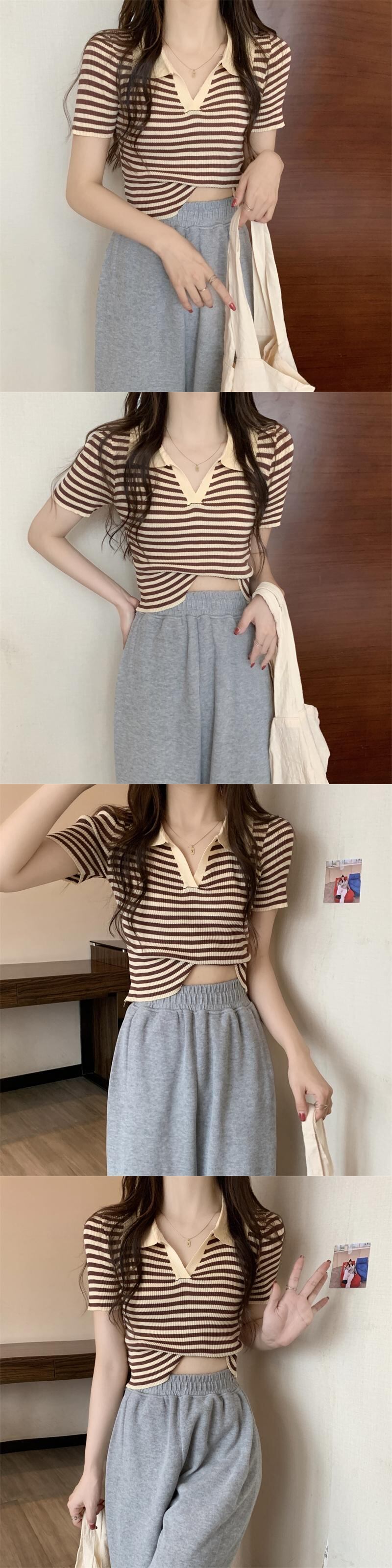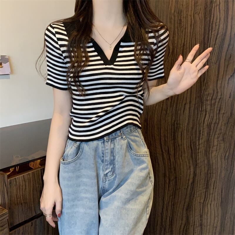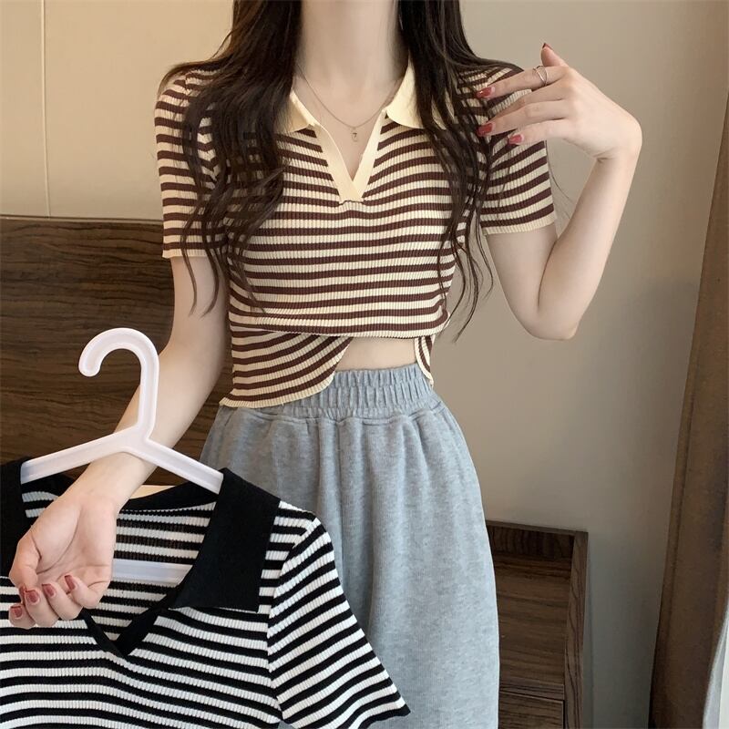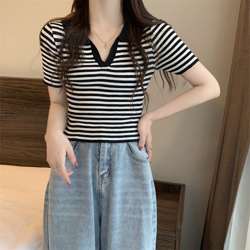 ラージサイズの婦人服2022年流行の婦人夏の新しいファットシスターファッションデザインポロカラースリムニットストライプTシャツ 大きめサイズ サマー 夏物 888414212342631