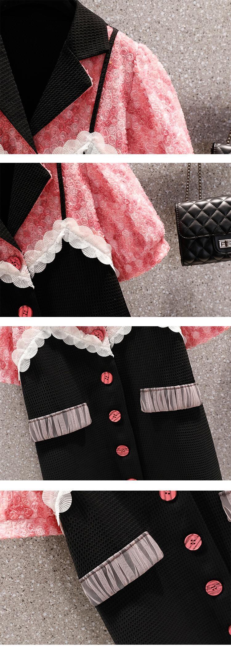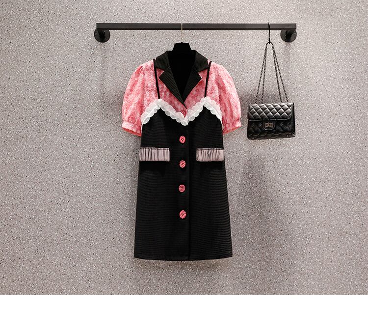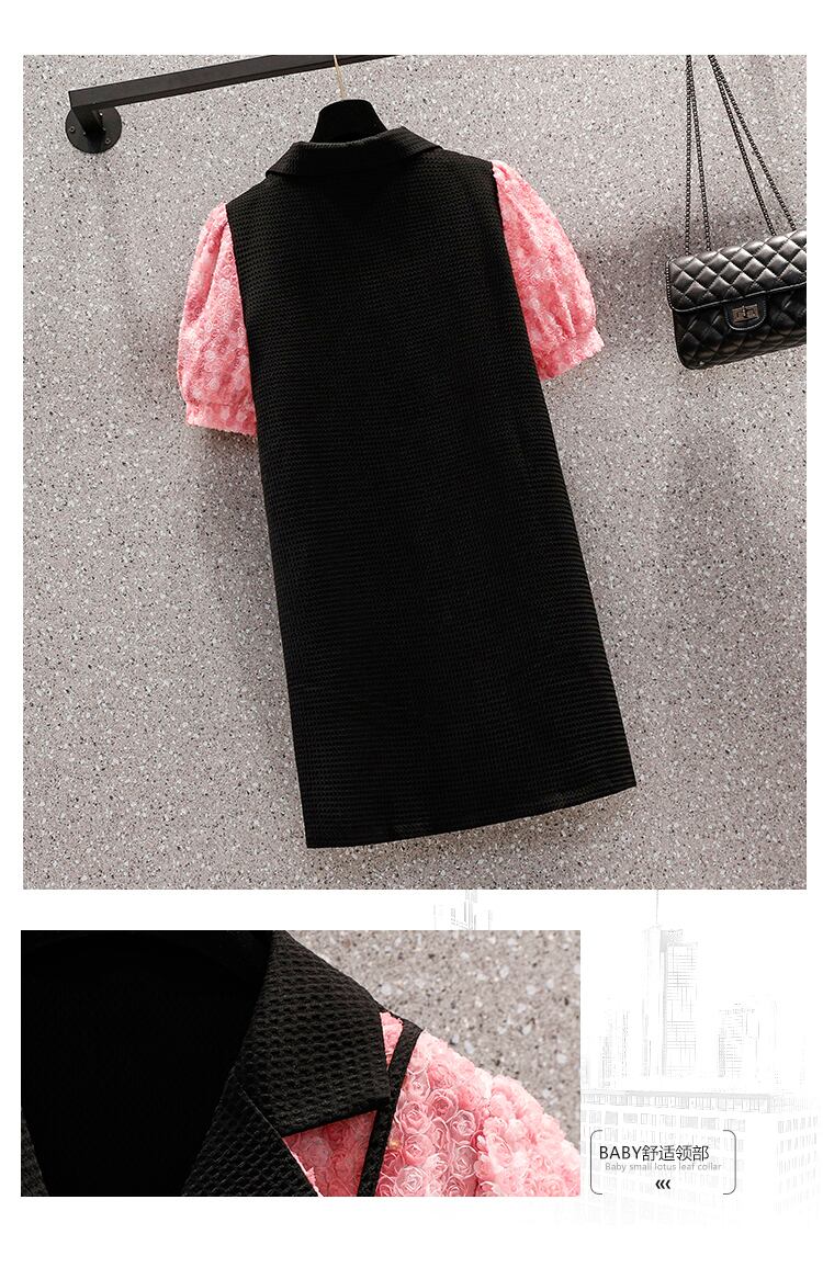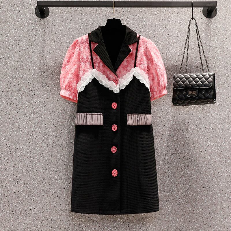 プラスサイズの婦人服2022ファットシスターサマーニューウエスタンスタイルデザインピンクステッチスリムフェイクツーピースドレス 大きめサイズ 夏物 8884168376049406