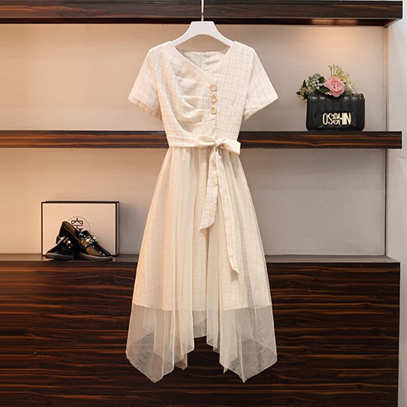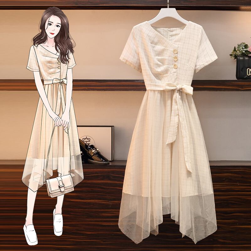 大きいサイズの婦人服2022年夏の新しい太った姉妹ファッション気質ウエストステッチ偽のツーピースカジュアルドレス 大きめサイズ サマー 夏物 8884120015558884
