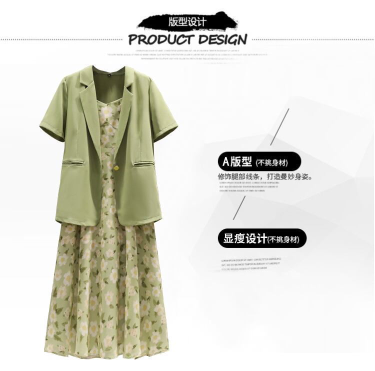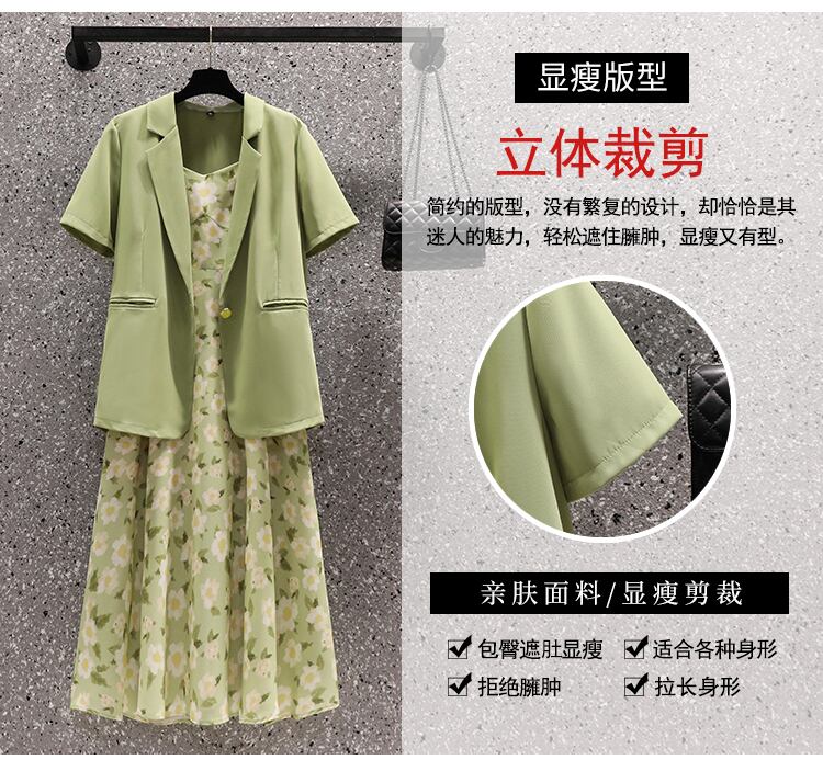 ラージサイズ婦人服2022ファットシスター夏新気性スーツジャケット痩身腹カバーサスペンダースカートツーピーススーツ 大きめサイズ サマー 夏物 8884136645120606