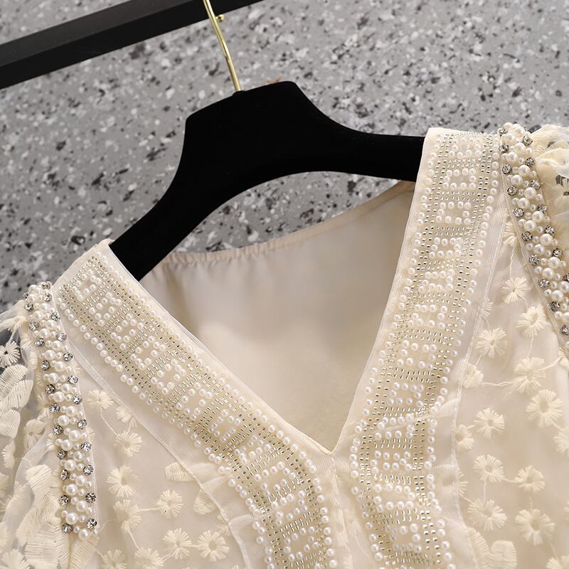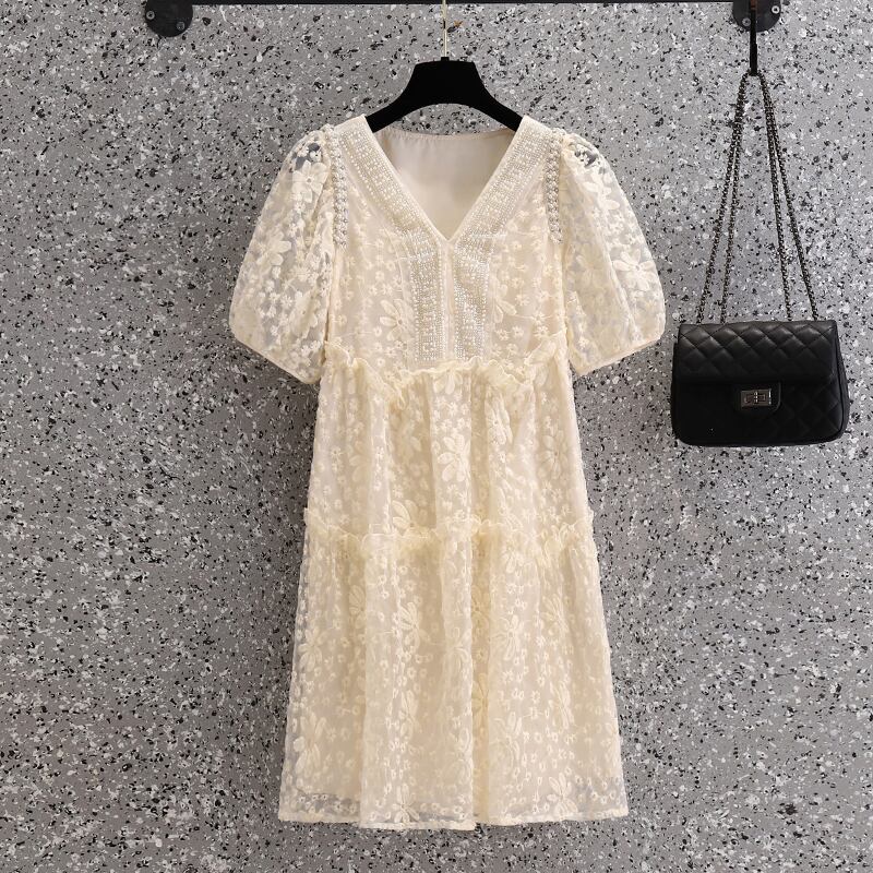 ラージサイズの婦人服2022年ファットシスターサマーニューレース刺繍半袖気質ルーズで薄いVネックワンピース レッド 大きめサイズ 夏物 8884175531444843