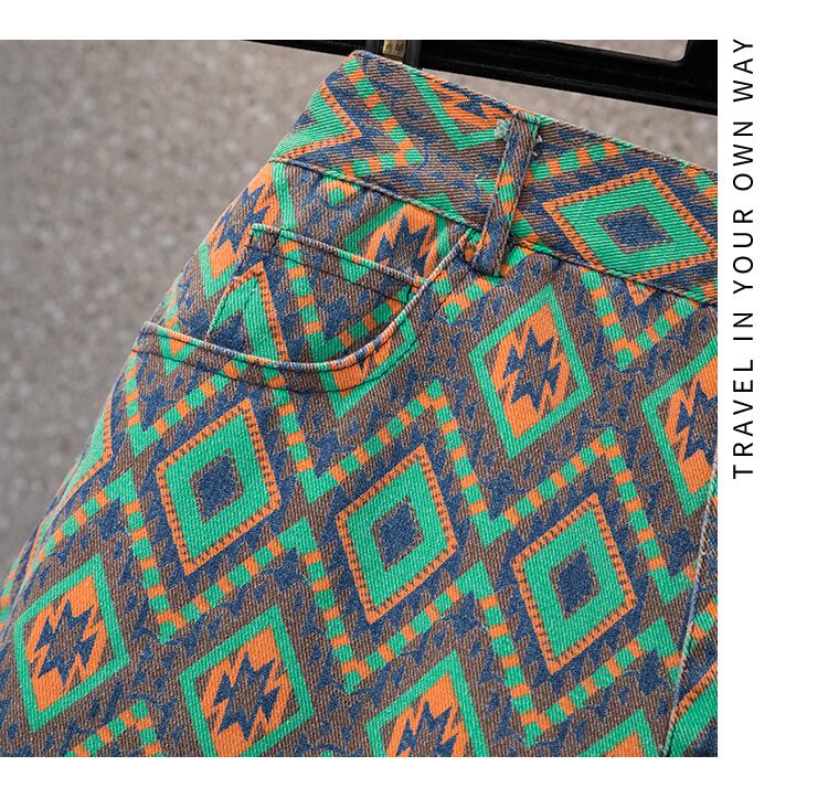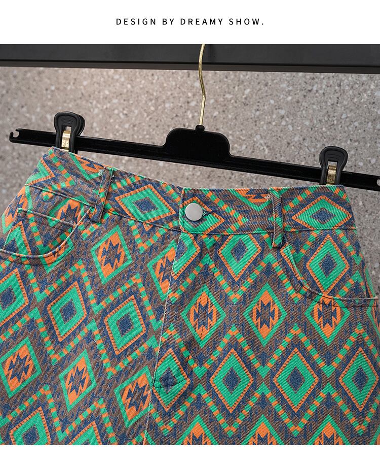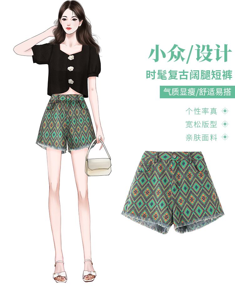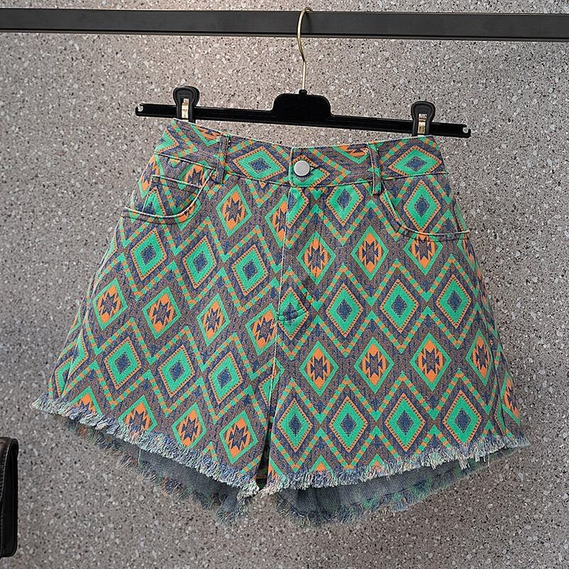 ラージサイズの婦人服2022年流行のレディースサマーニューファットシスターファッション菱形プリントデニムワイドレッグローエッジショーツレディース 大きめサイズ 夏物 ブルマー 8884169172593134