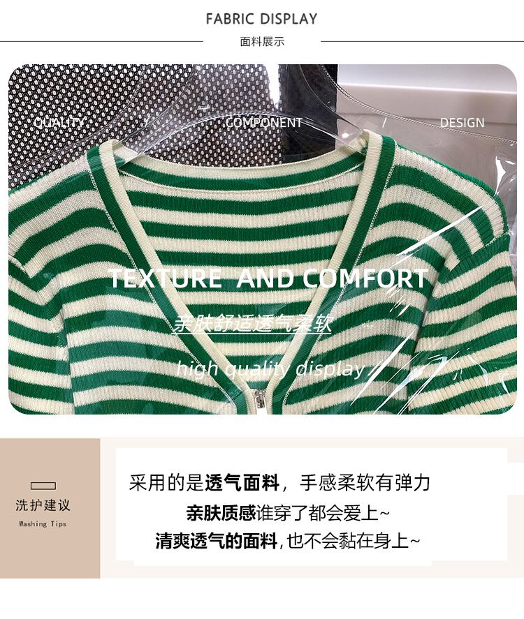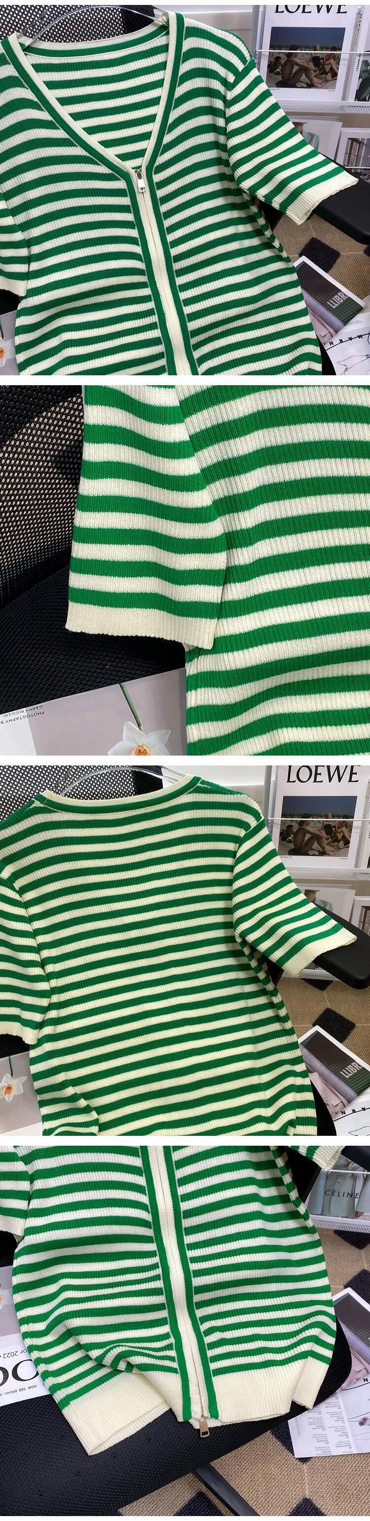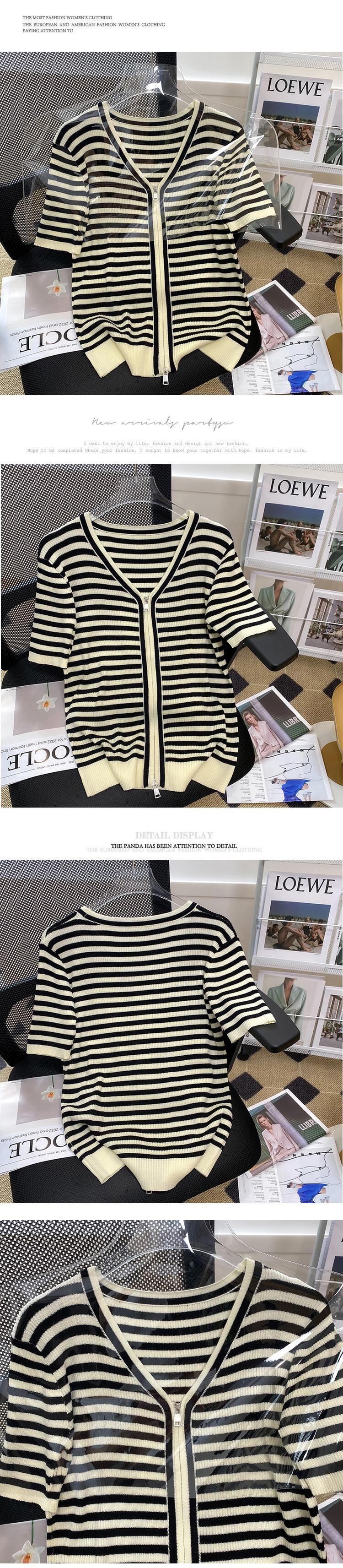ラージサイズの婦人服2022年夏の新作ファットシスターストライプルーズニット半袖デザインセンスジッパーカーディガンTシャツ 大きめサイズ サマー 夏物 8884169859027153