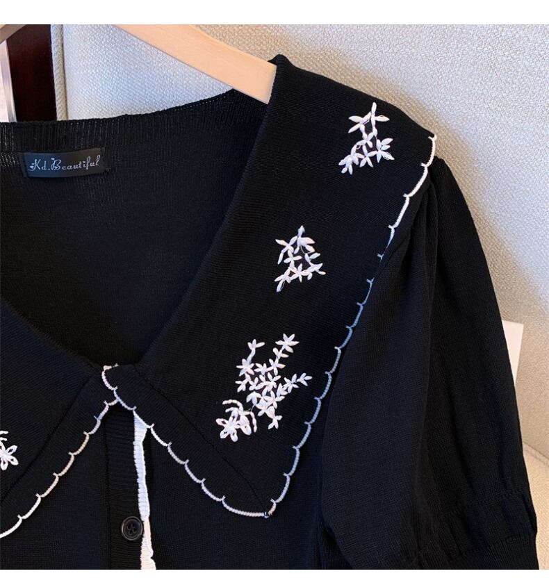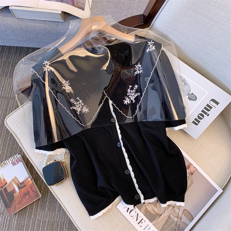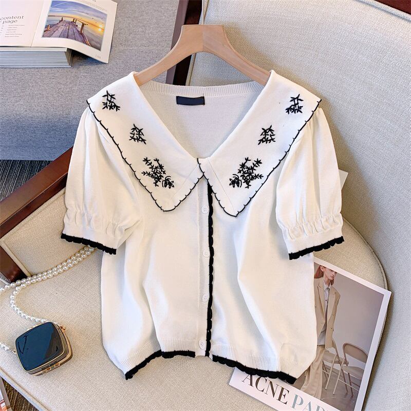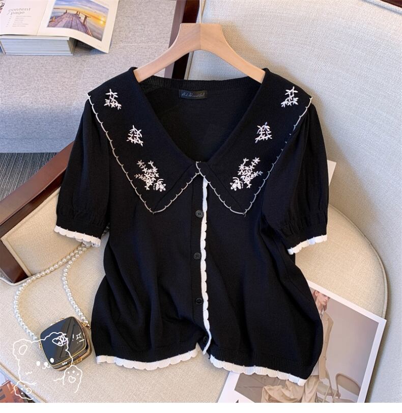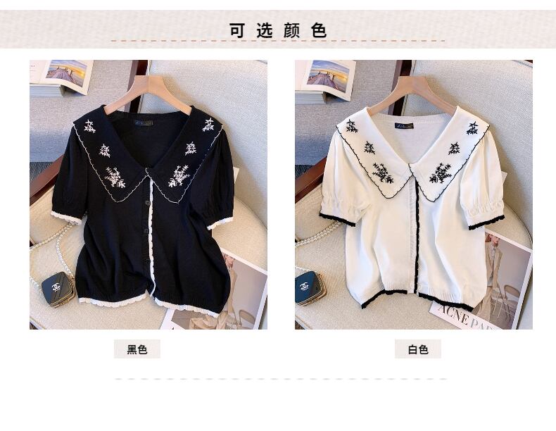 大きいサイズの婦人服2022年の太った姉妹夏の新しい薄い半袖の刺繍された人形の襟薄いニットのセータートップの女性 レッド 大きめサイズ サマー 夏物 8884157371841543
