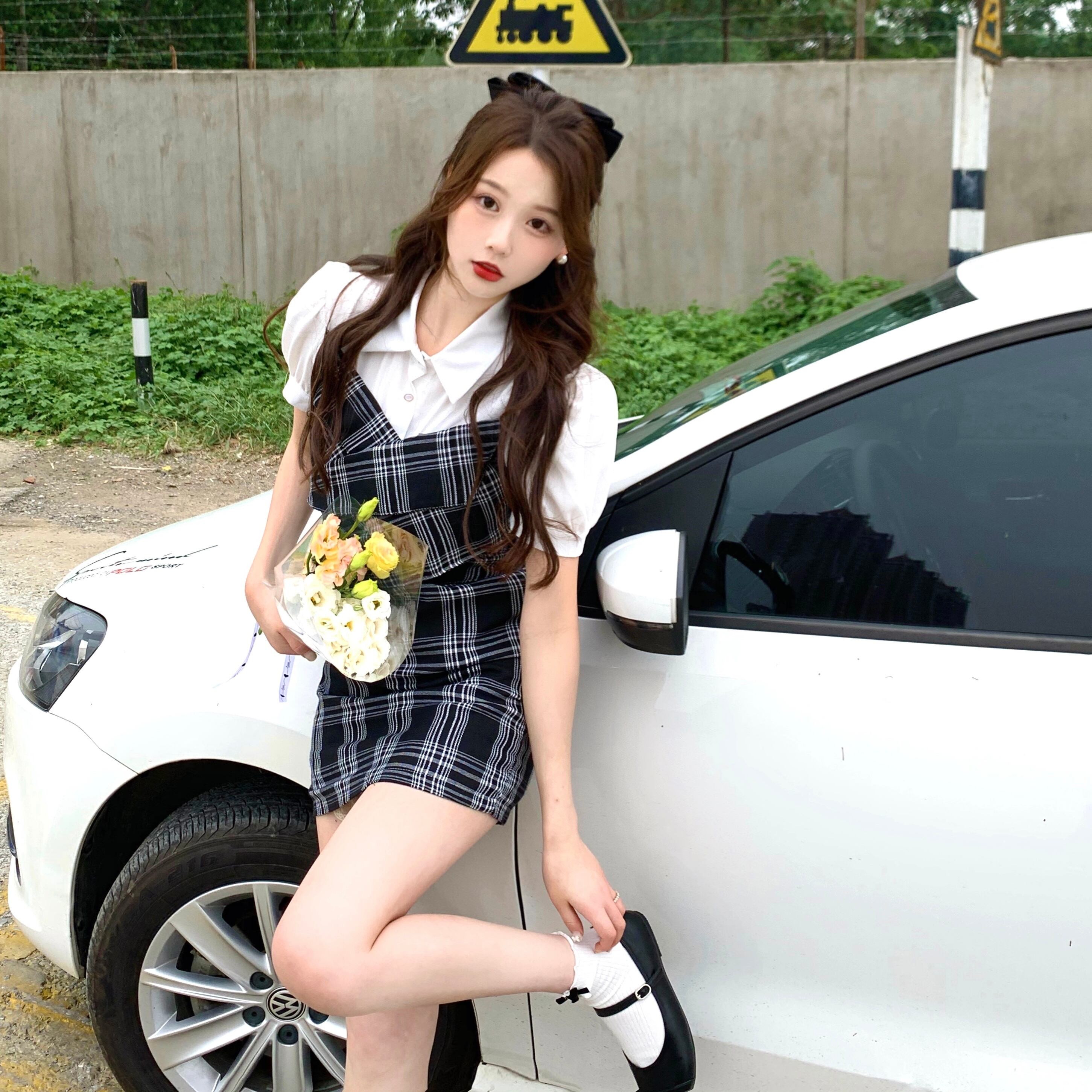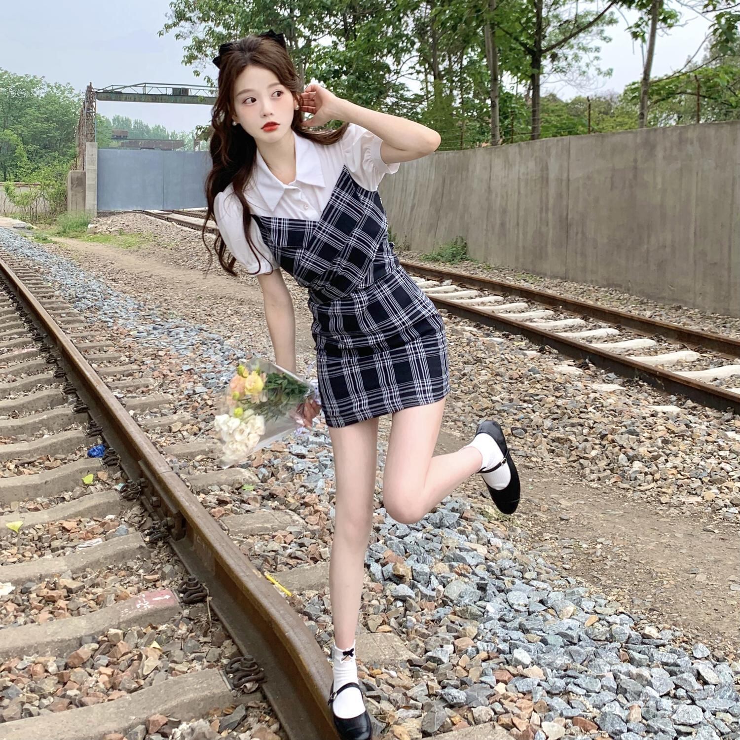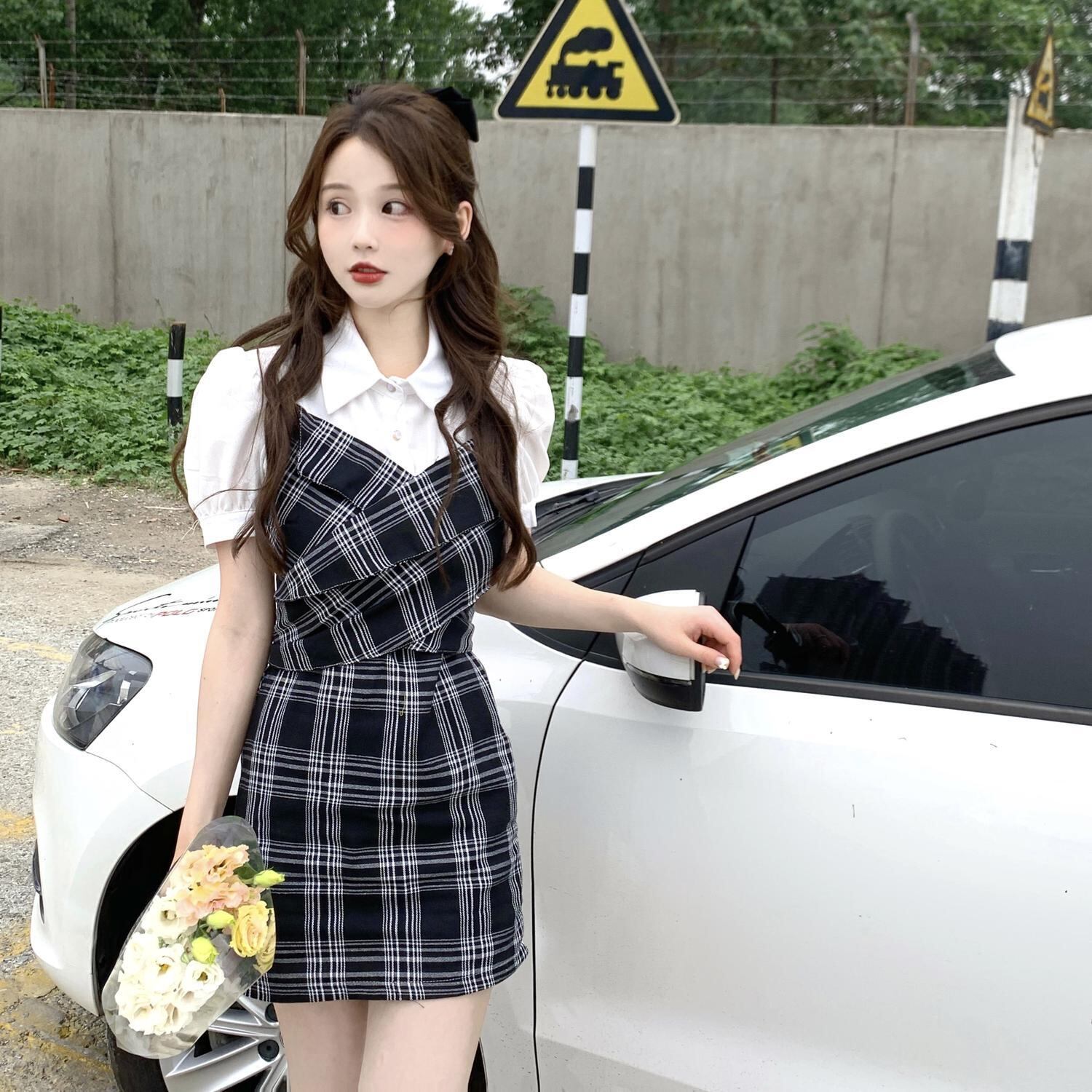 ラージサイズの婦人服2022年ファットシスターサマーニューステッチフェイクツーピーススリムシャツスカート年齢を減らすチェック柄ドレス 大きめサイズ 夏物 8884116070067120