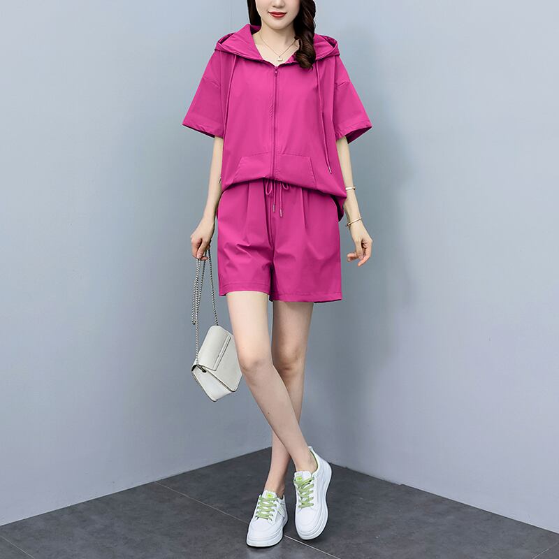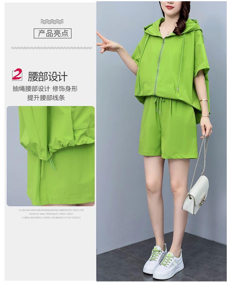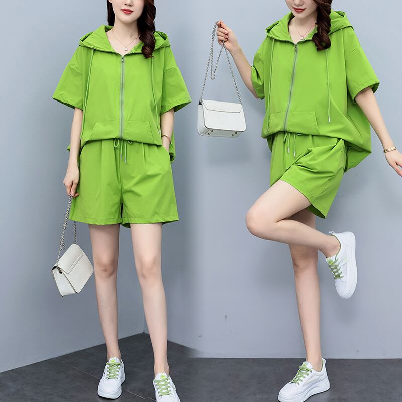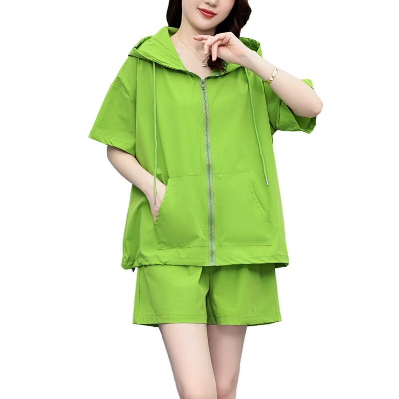 大きいサイズの婦人服 2022 ファットシスター夏の新しいフード付き日焼け止めジャケットカジュアルショーツ洋風ツーピーススーツ 大きめサイズ サマー 夏物 ブルマー 8884175344107379