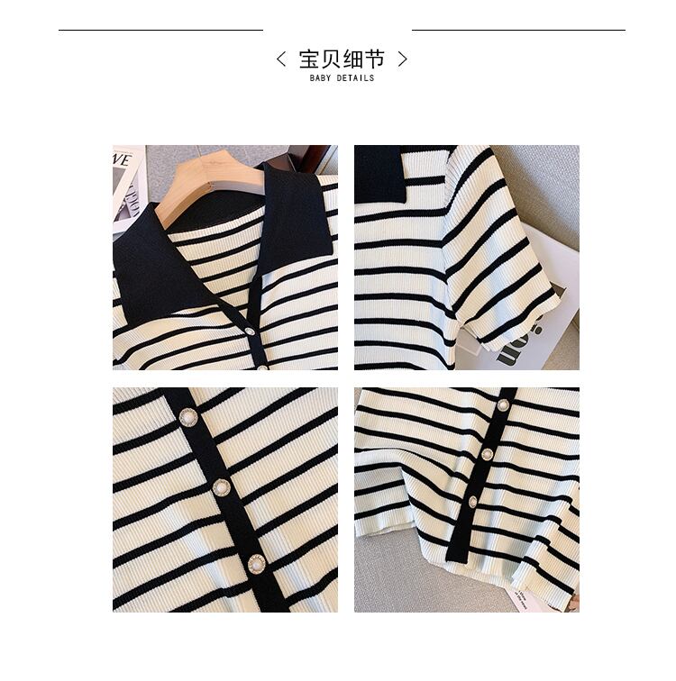 大サイズの婦人服 2022 夏新ファットシスターファッションステッチストライプラペルカーディガンニット半袖 Tシャツ女性 大きめサイズ サマー 夏物 8884169436565349