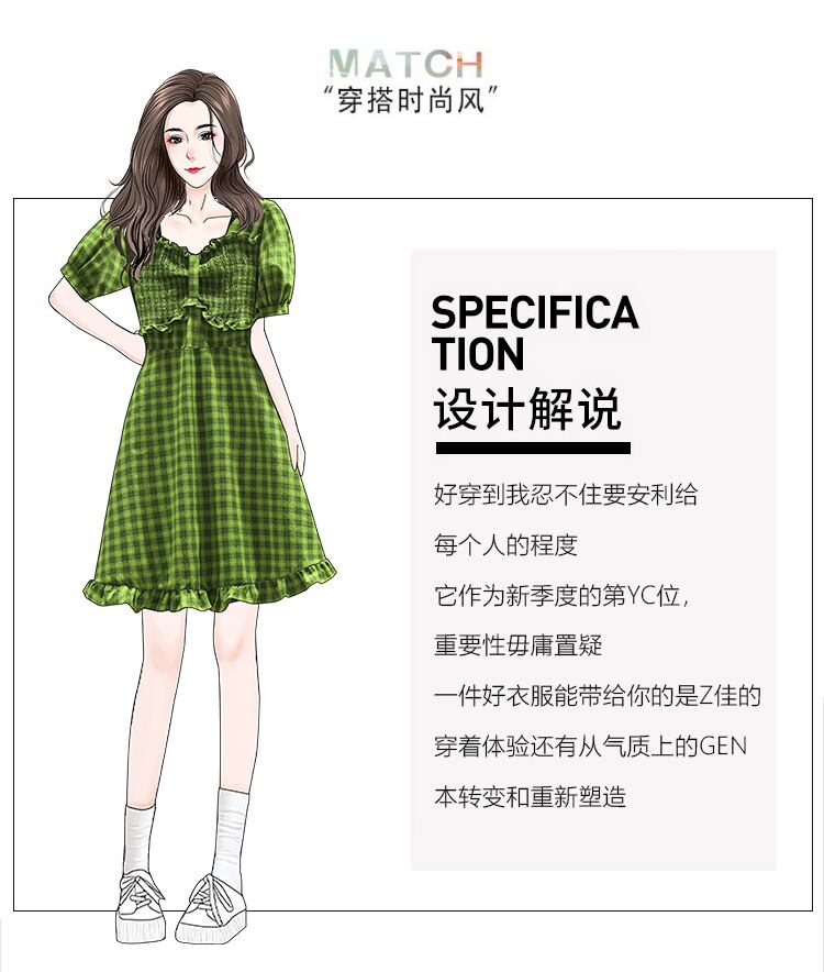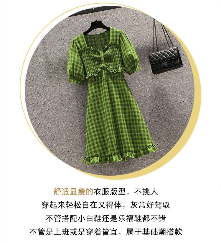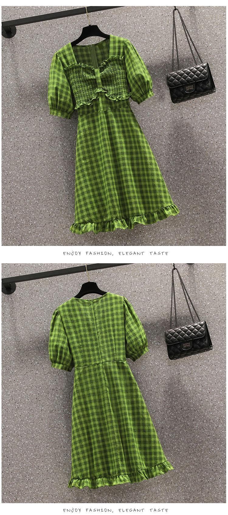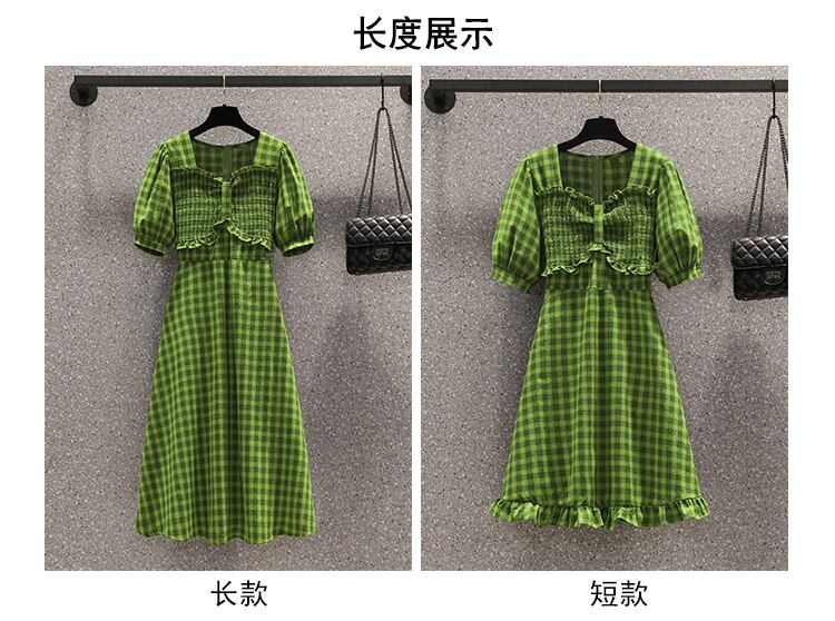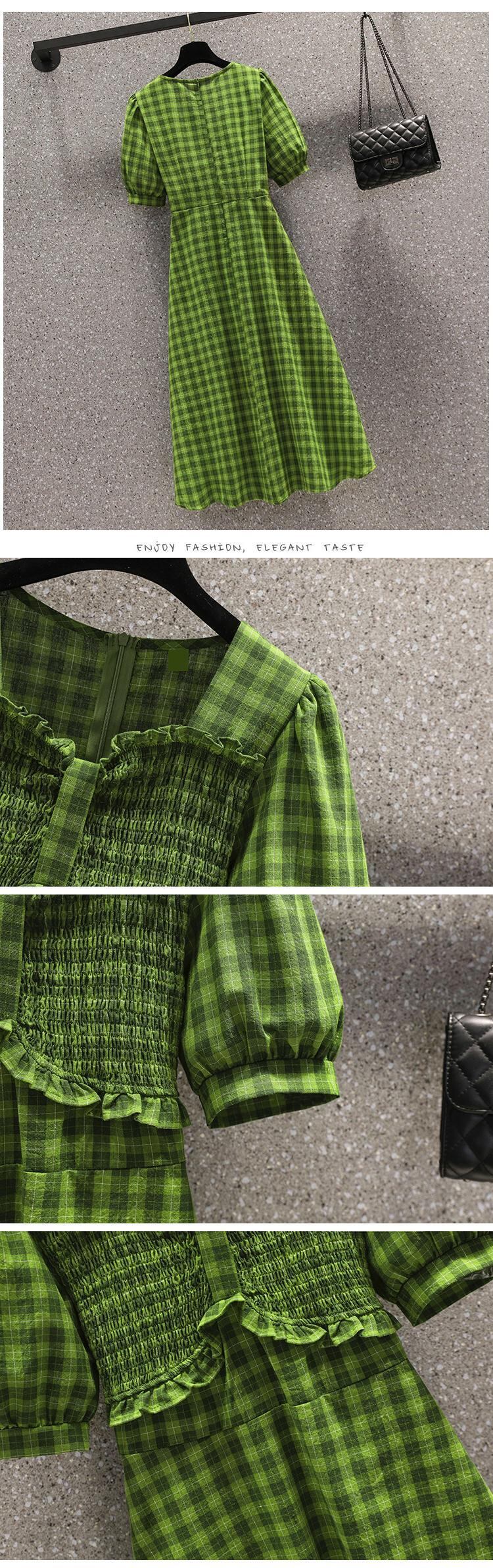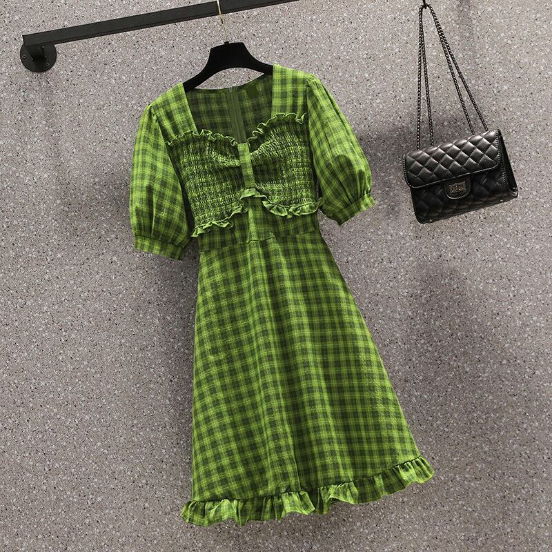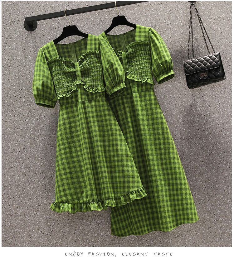 大きいサイズの婦人服 2022 ファット シスター夏の新しいスタイルの a ライン スカート、緑の格子縞のウエスト ドレス 大きめサイズ サマー 夏物 Aライン グリーン 8884198643988368