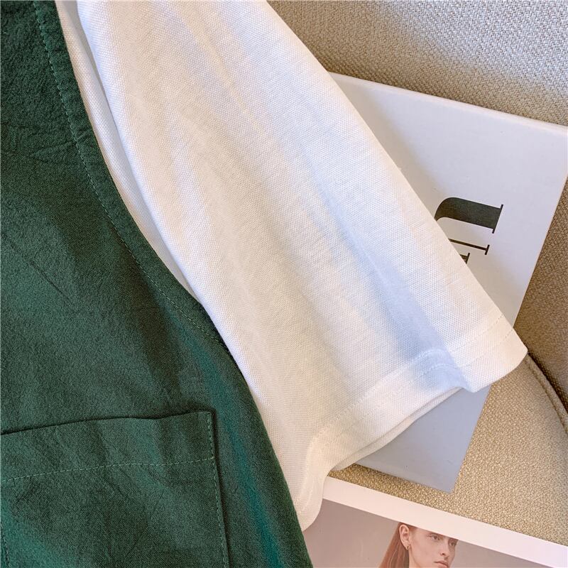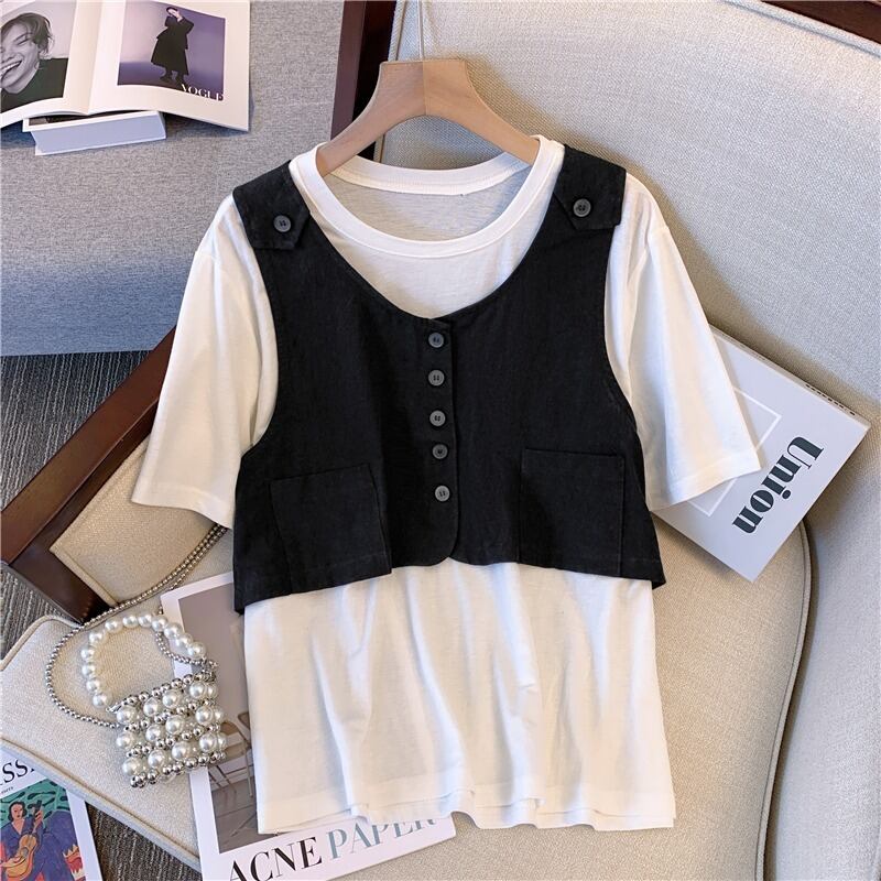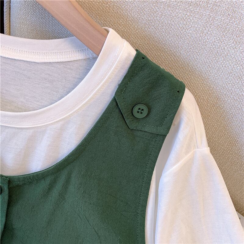 大きいサイズの婦人服 2022 夏新ファットシスターフェイクツーピースステッチトップ無地ファッションカジュアルパンツツーピースセット 大きめサイズ サマー 夏物 ソリッドカラー 8884149073185256