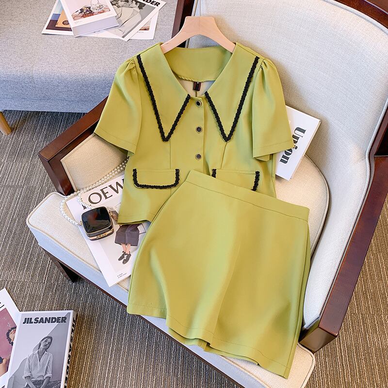 大きいサイズの婦人服 2022 トレンディな女性の夏の新しいファットシスターファッション人形の襟 Tシャツハイウエストオールマッチショートスカート 2 点セット ハイウェスト 大きめサイズ サマー 夏物 888418804782236