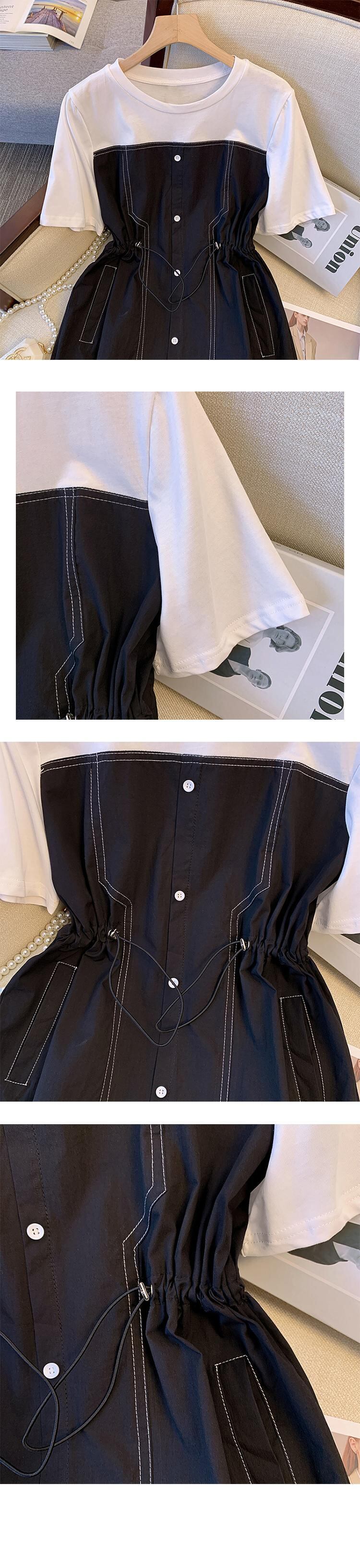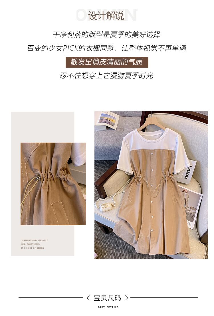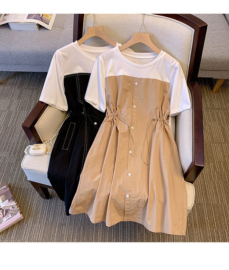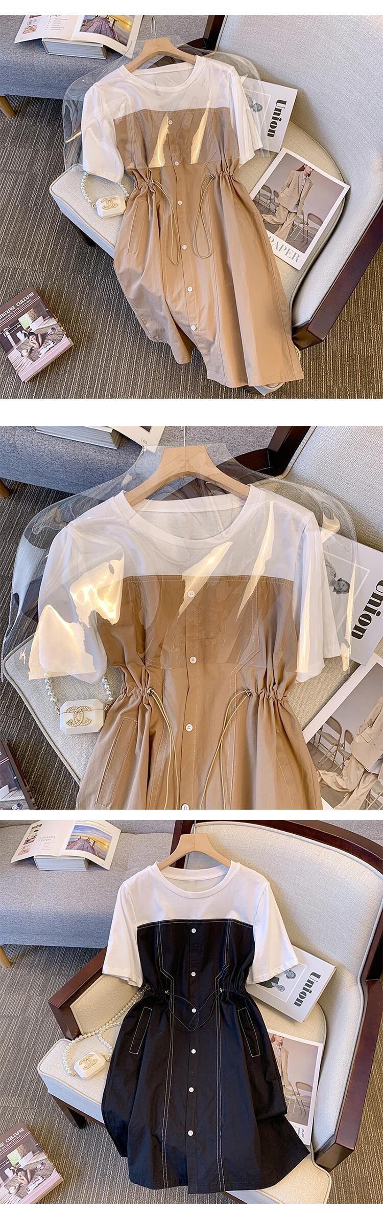 大きいサイズの婦人服 2022 ファットシスター夏の新しいファッションオールマッチ薄い洋風ステッチ巾着ウエストドレス 大きめサイズ サマー 夏物 8884131079692293