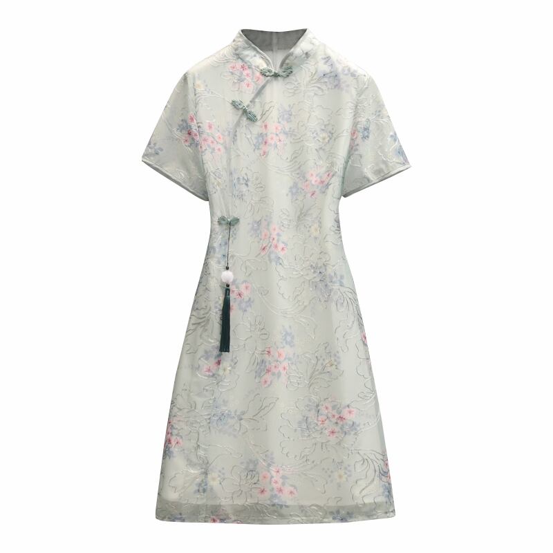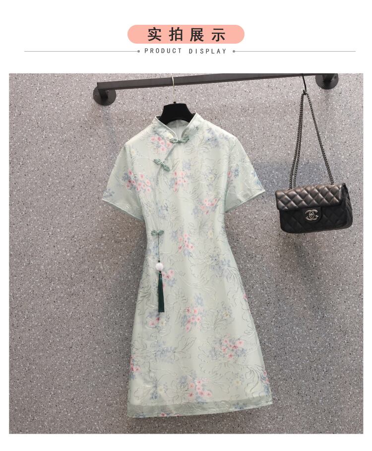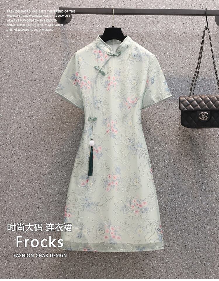 大サイズの婦人服 2022 ファットシスター夏新シフォン気質刺繍スリムミッドレングスのチャイナドレス 大きめサイズ サマー 夏物 8884187232184714