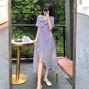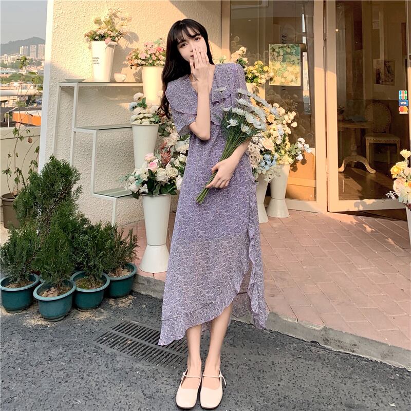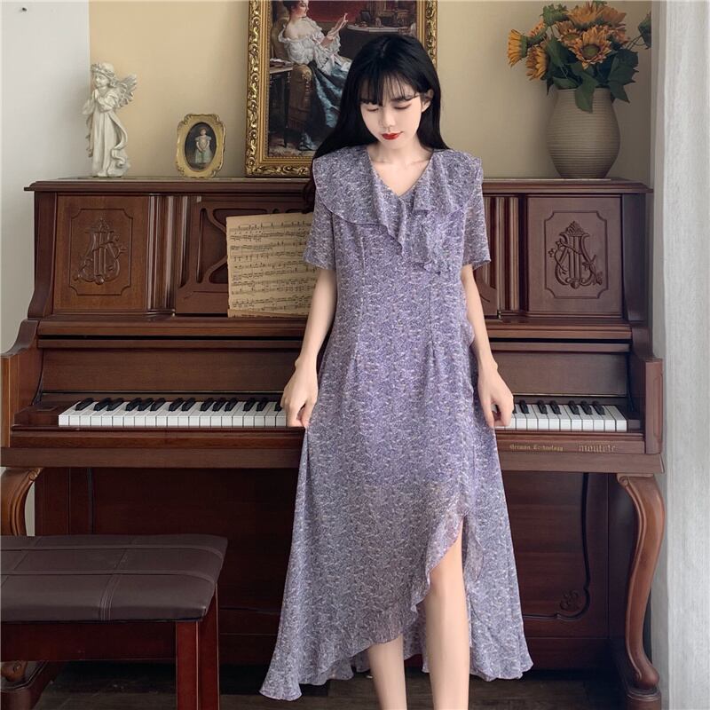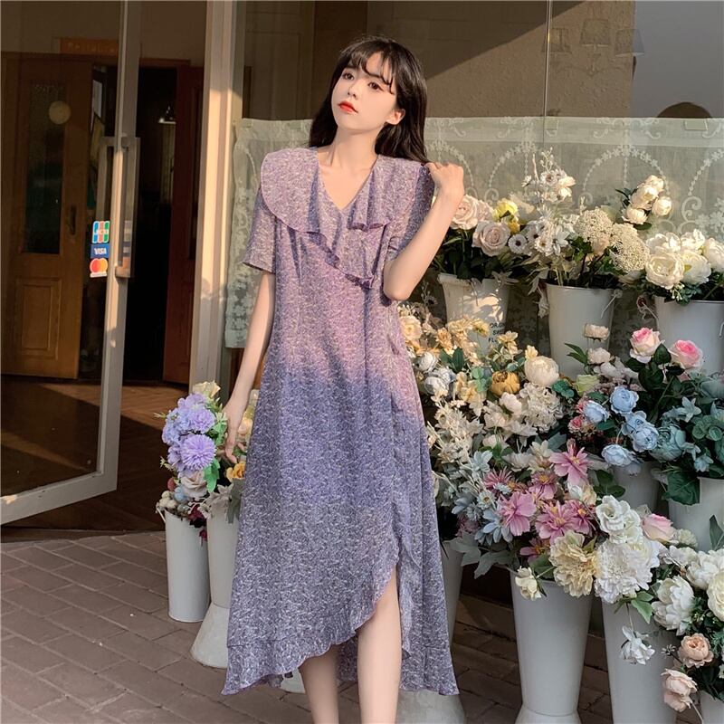 プラスサイズの婦人服 2022 ファットシスター夏の新しい痩身デザインフラウンス花柄シフォン半袖ドレス 大きめサイズ サマー 夏物 8884156848357119