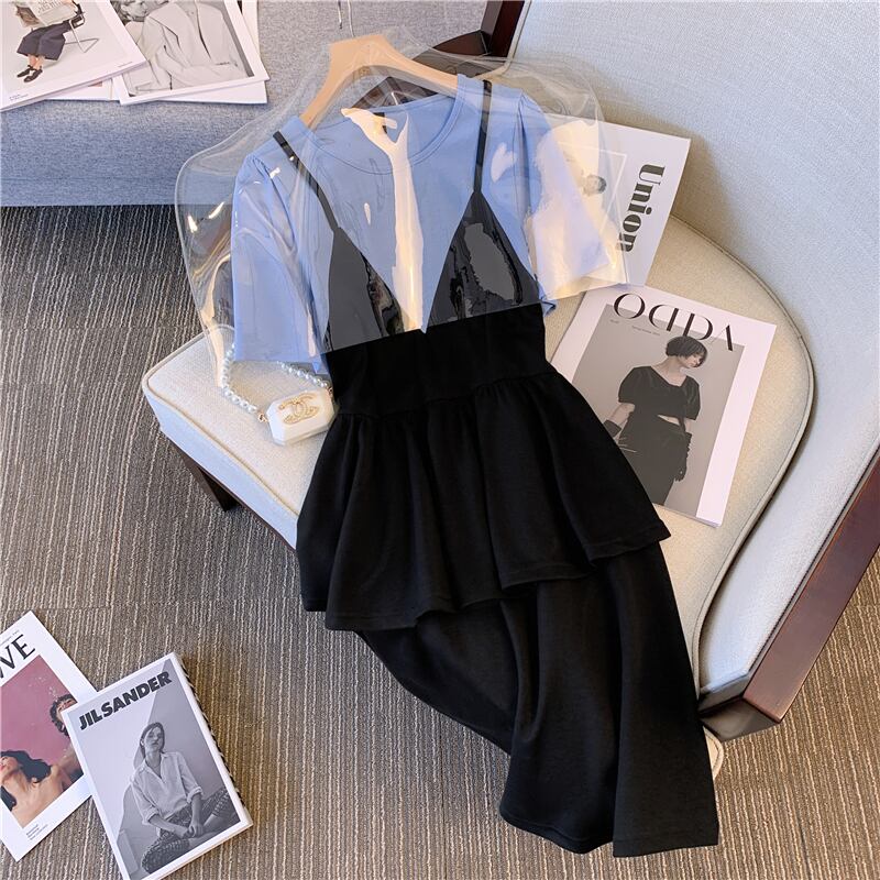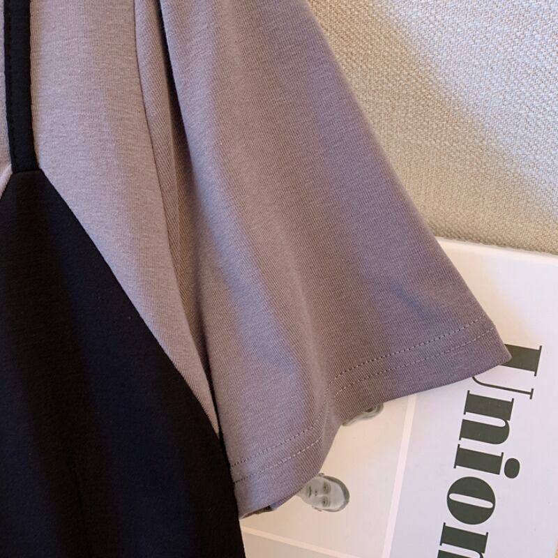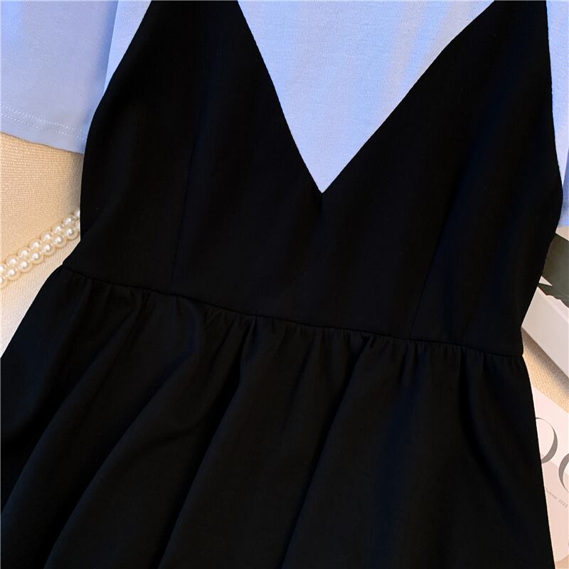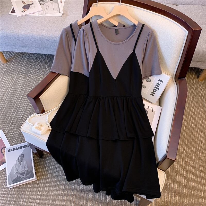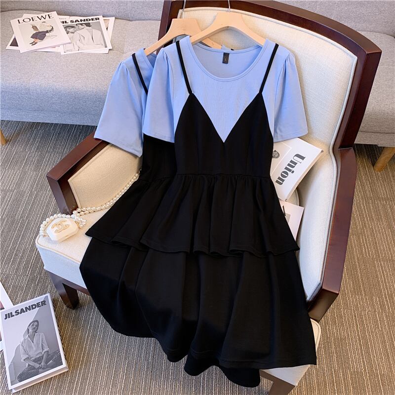大きいサイズの婦人服 2022 夏の新しいファット シスター ファッション デザイン センス フレンチ コントラスト カラー フェイク ツーピース ステッチ ドレス 大きめサイズ サマー 夏物 8884181475112184