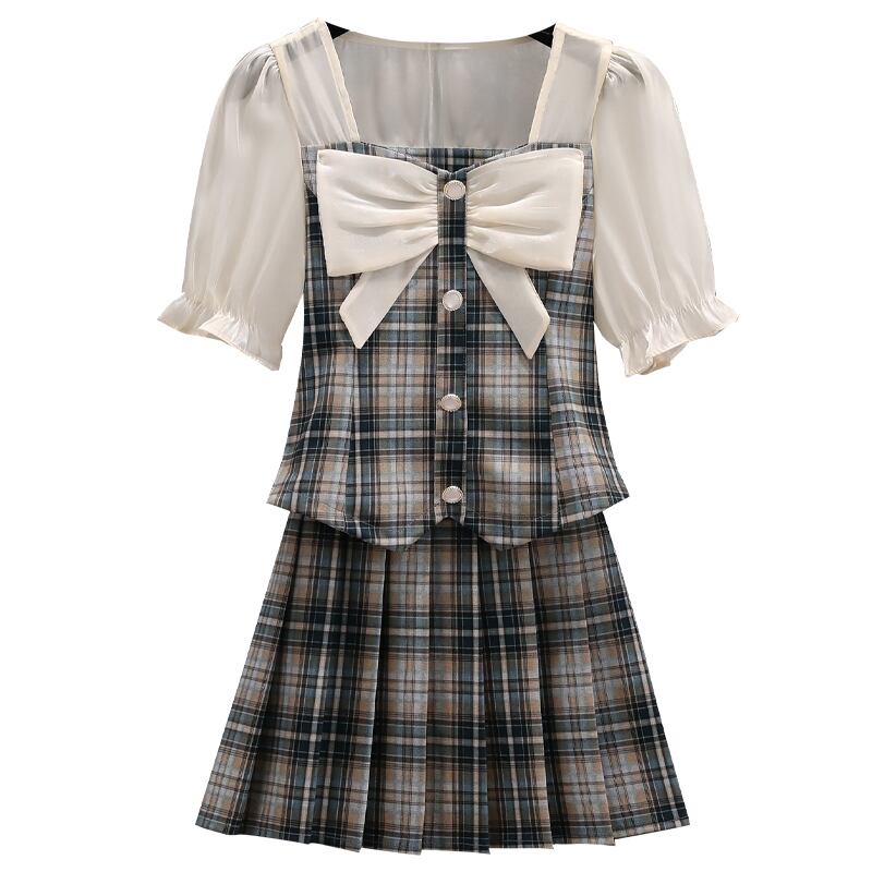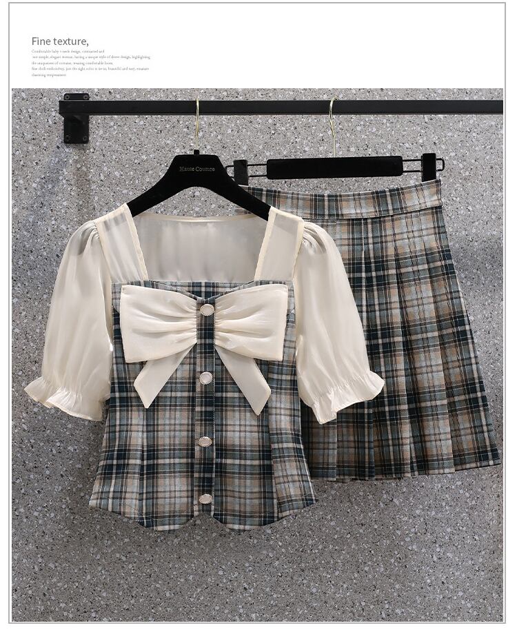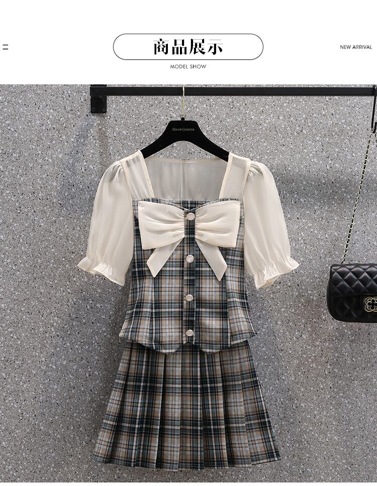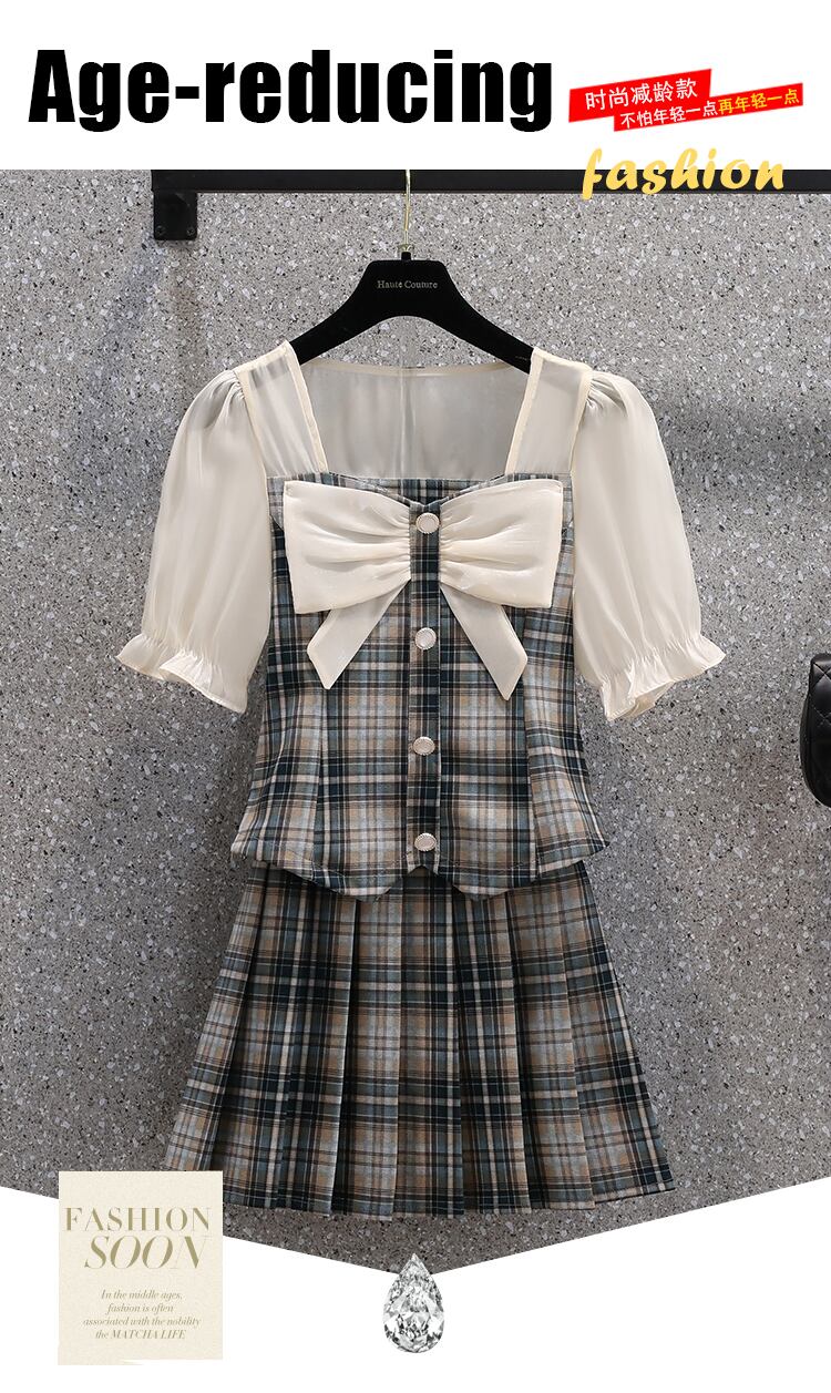 大きいサイズの婦人服 2022 ファットシスター夏の新しいフレンチスウィート弓プリーツスカートファッションチェック柄ツーピースセット リボン 大きめサイズ 大人ガーリー キュート カジュアル サマー 夏物 8884199305373637