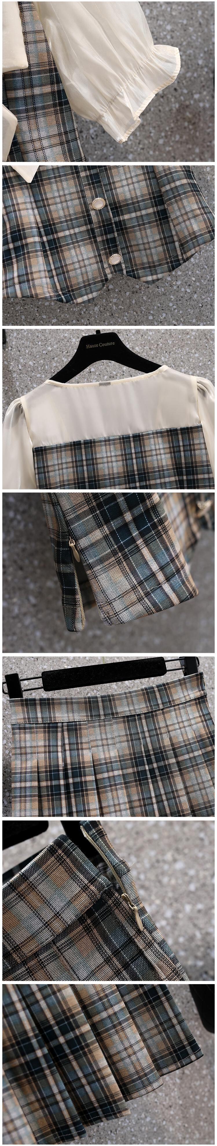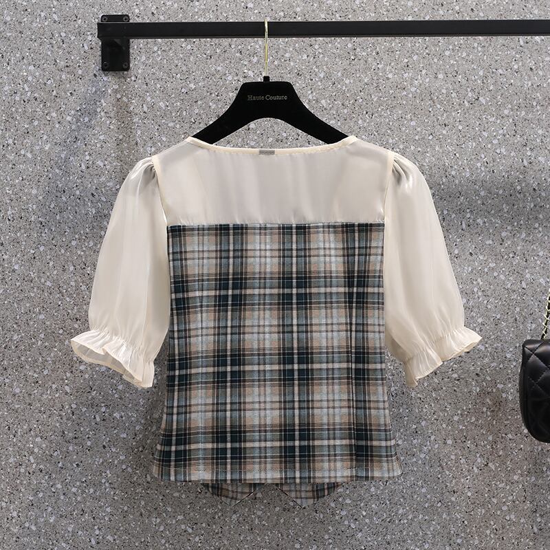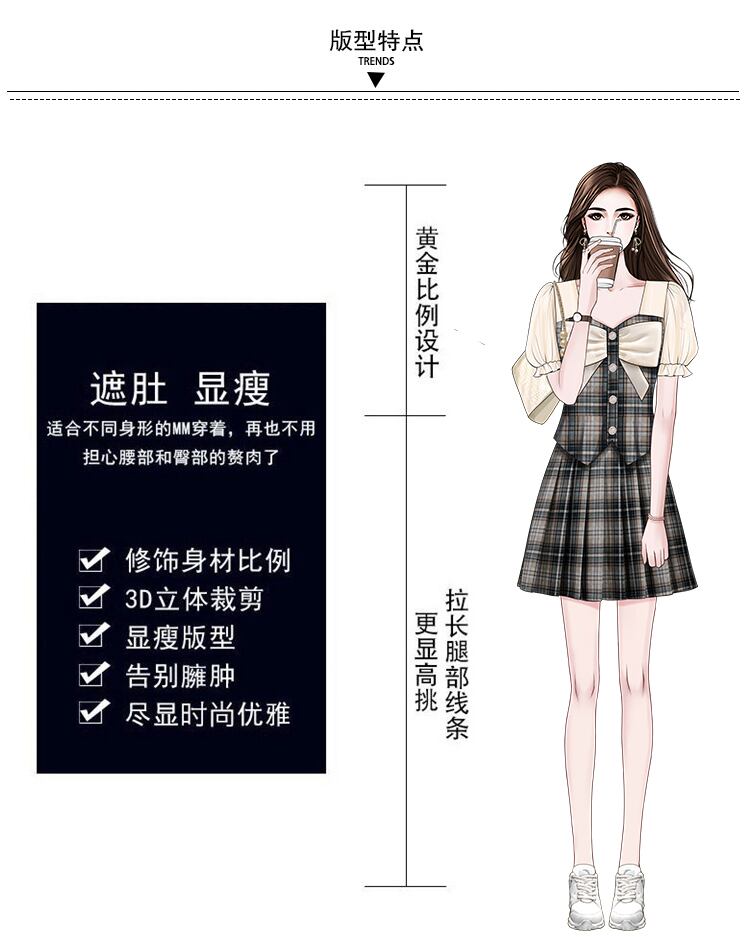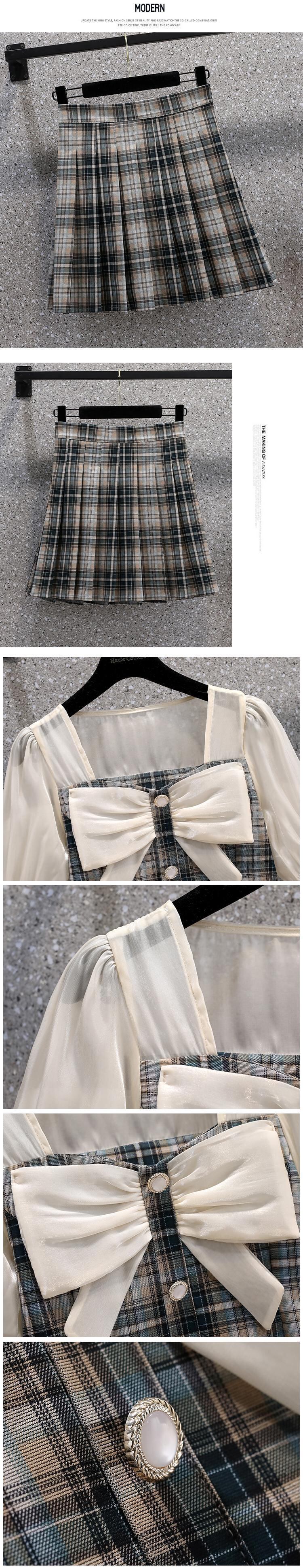 大きいサイズの婦人服 2022 ファットシスター夏の新しいフレンチスウィート弓プリーツスカートファッションチェック柄ツーピースセット リボン 大きめサイズ 大人ガーリー キュート カジュアル サマー 夏物 8884199305373637