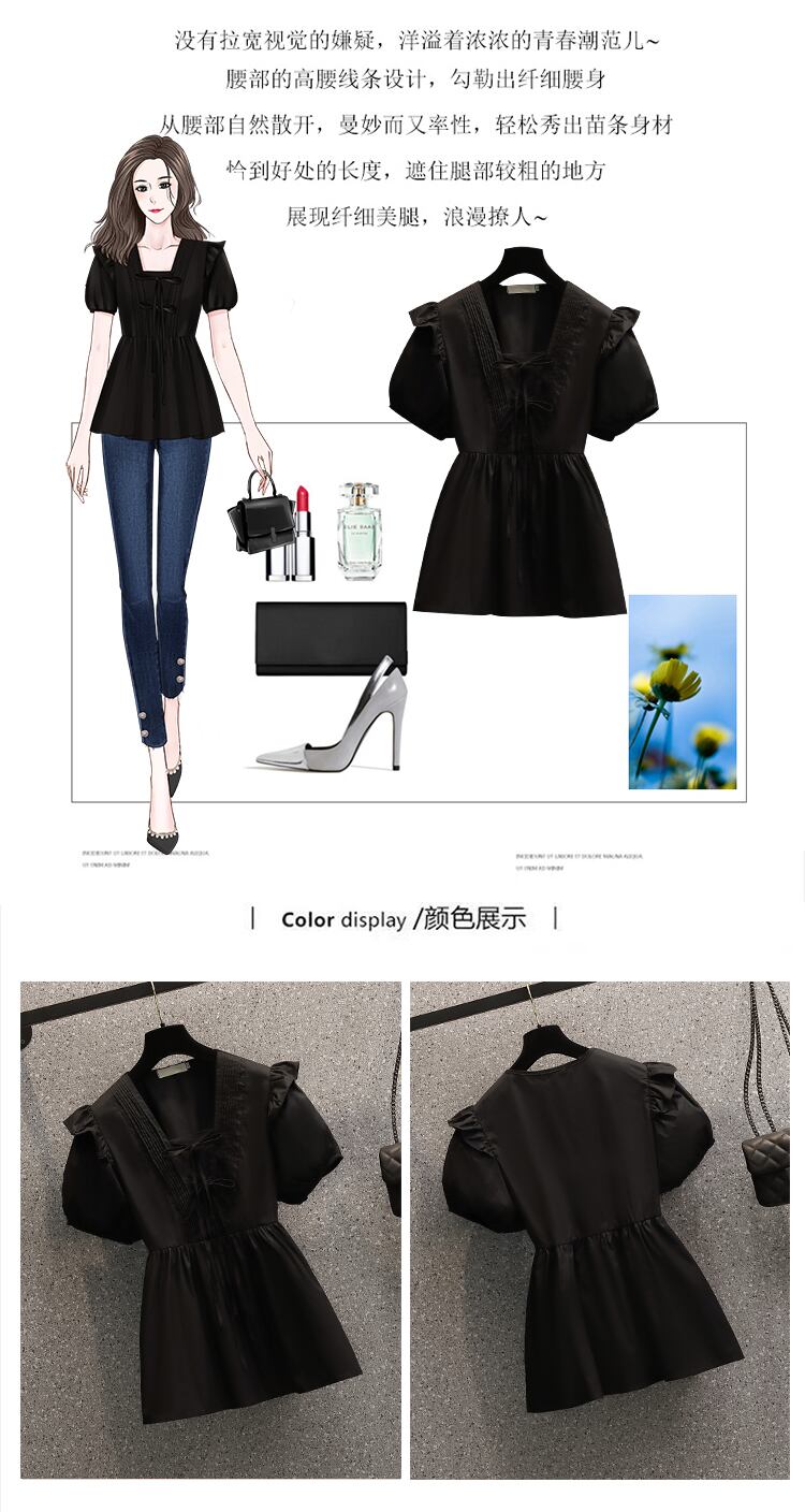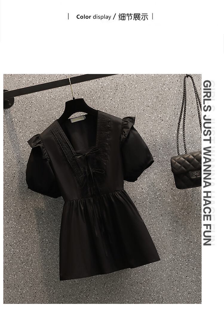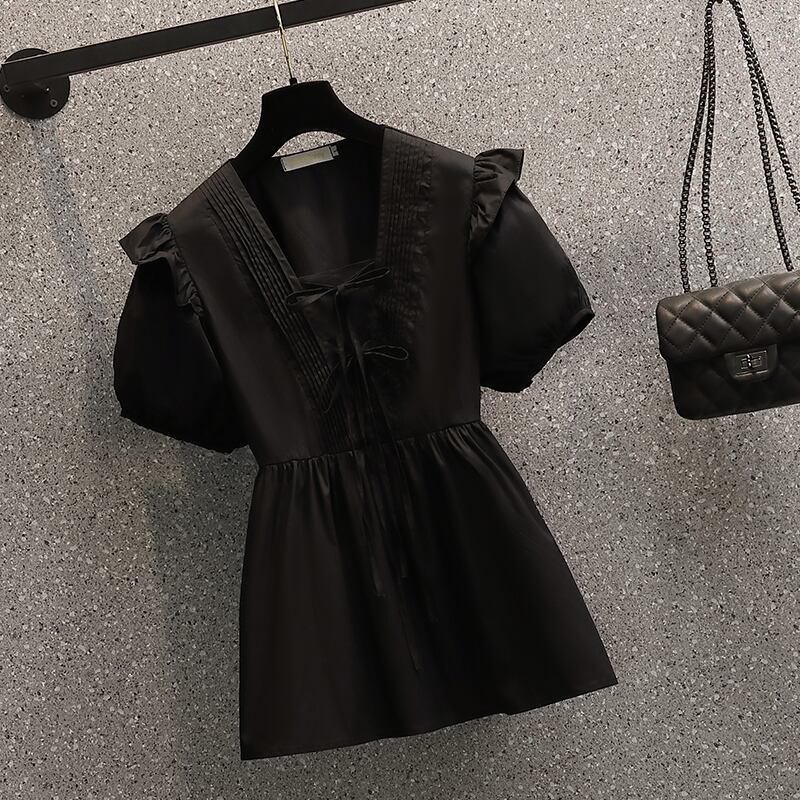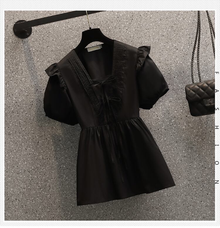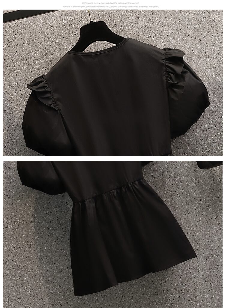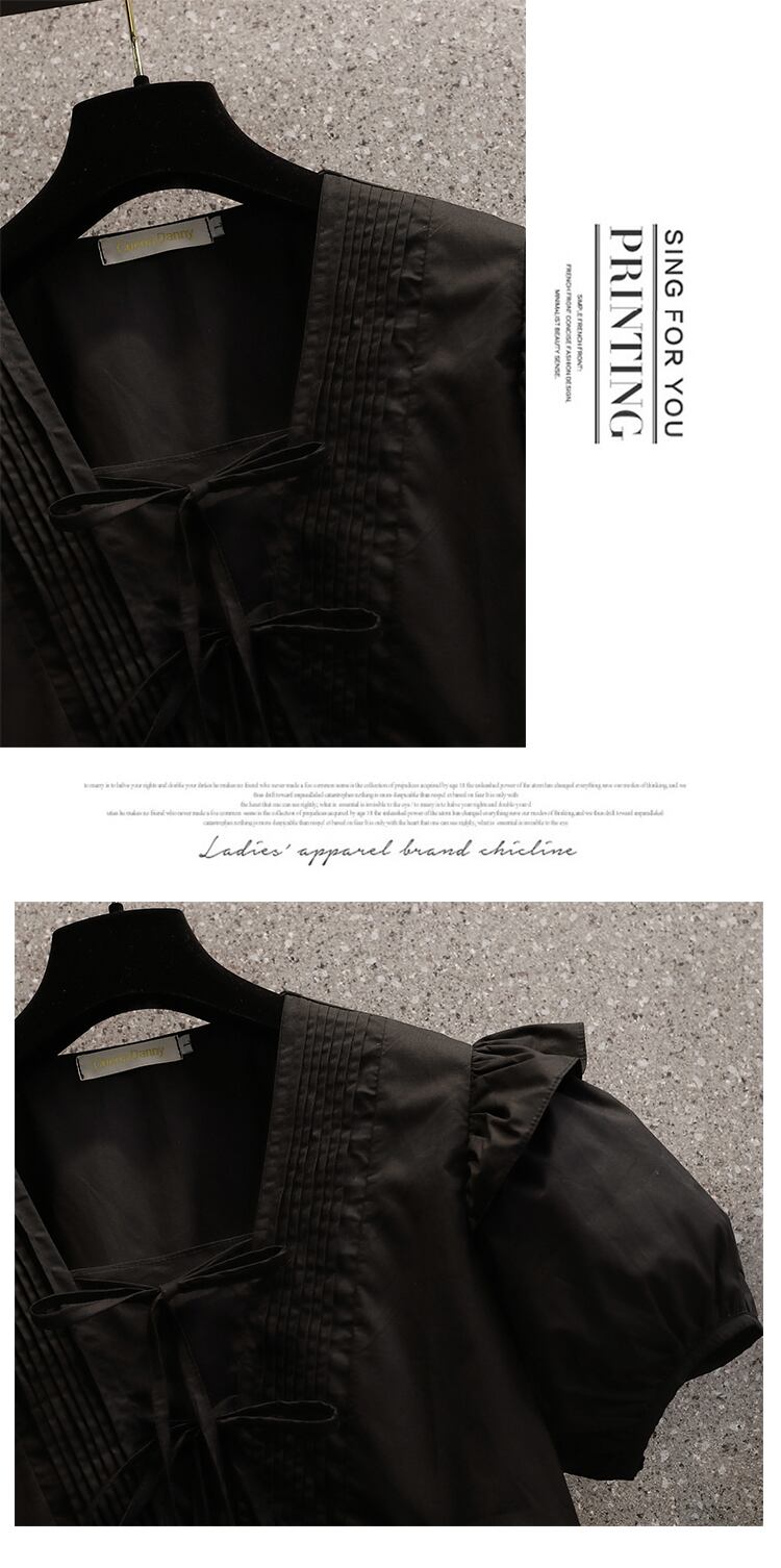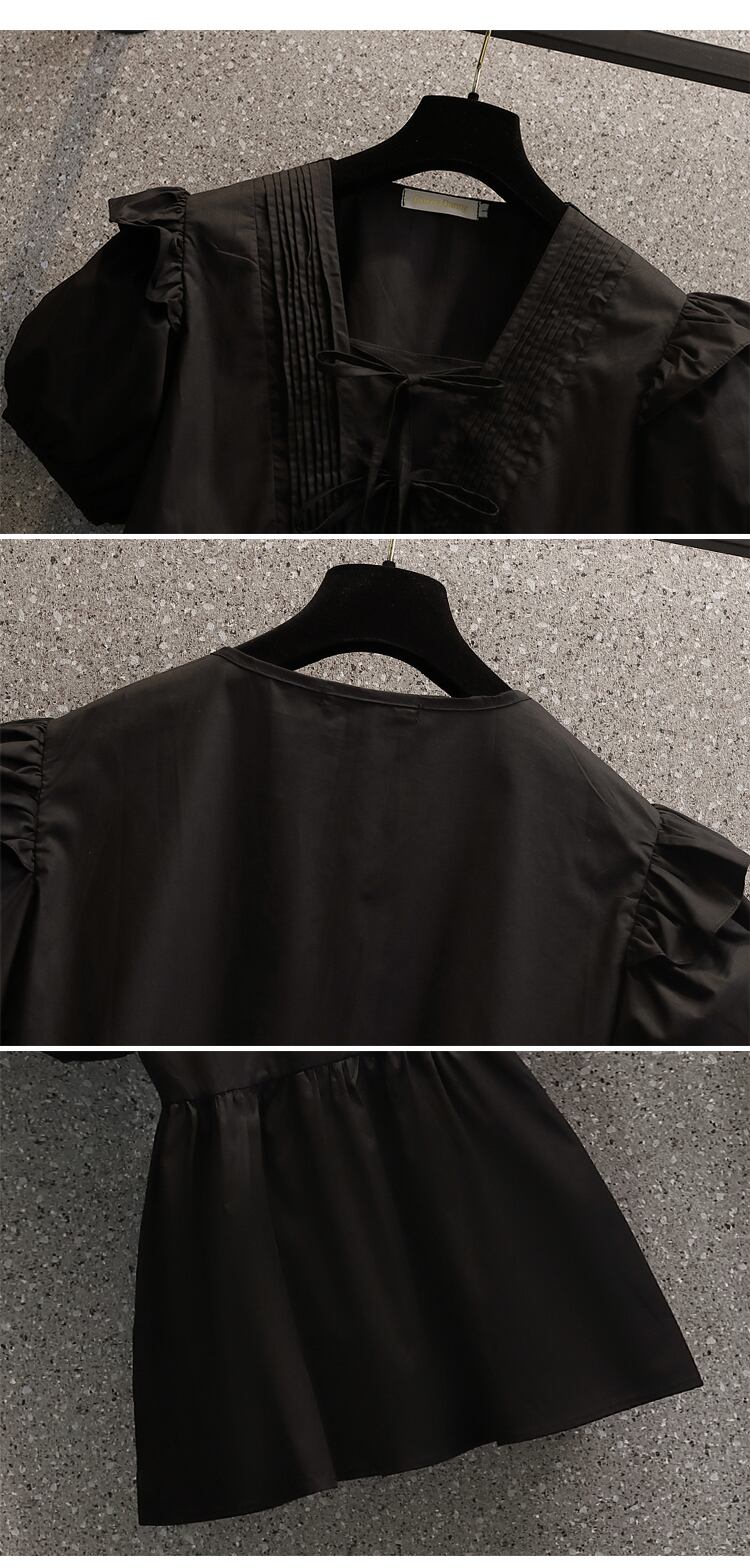 2022 夏新大サイズの女性のファッションパフスリーブ V ネックネクタイオールマッチ無地洋風シャツトップ 大きめサイズ サマー 夏物 Vネック ソリッドカラー 8884135081867961