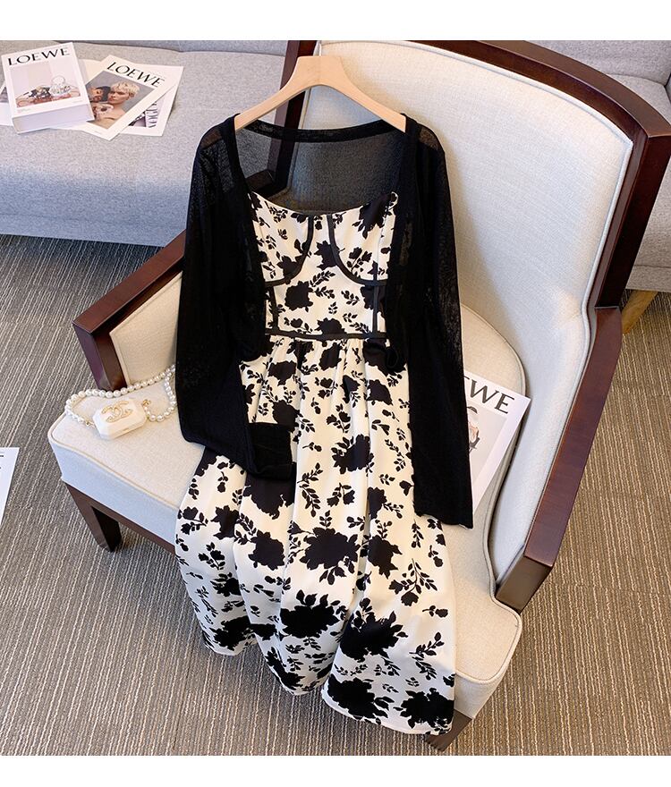 大きいサイズの婦人服 2022 トレンディな女性の夏の新しいファットシスターファッションニット日焼け止めシャツサスペンダードレスツーピーススーツ 大きめサイズ サマー 夏物 8884131506626575