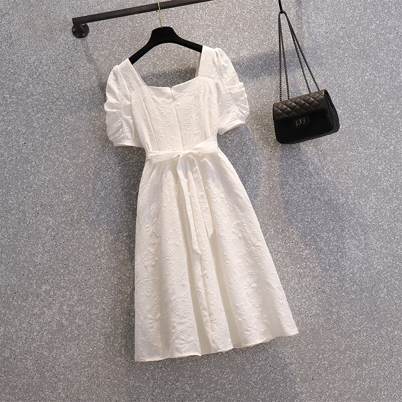 大きいサイズの婦人服 2022 太った姉妹の夏の新しい年齢を減らすレトロ スカート ミッドレングス ジャカード スクエア カラー スリム ドレス 大きめサイズ サマー 夏物 スクウェア 8884186239206145
