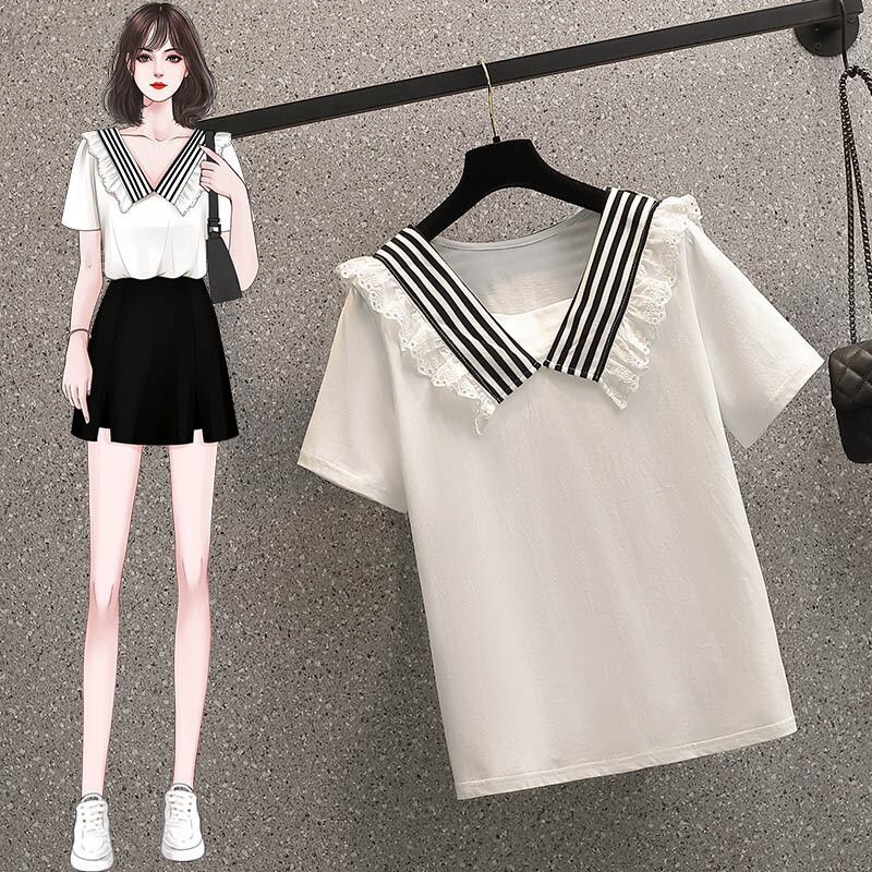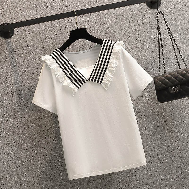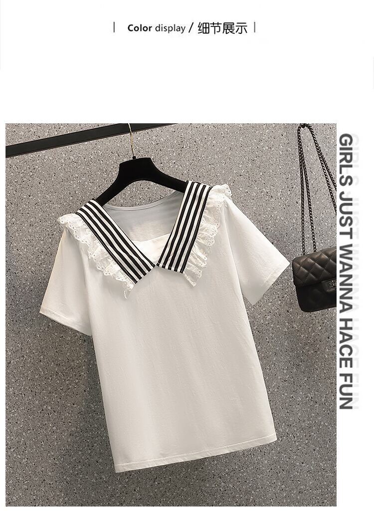 大サイズの婦人服 2022 ファットシスター夏新スタイルストライプネイビーショール人形の襟半袖 Tシャツトップ女性 大きめサイズ サマー 夏物 8884128879739571