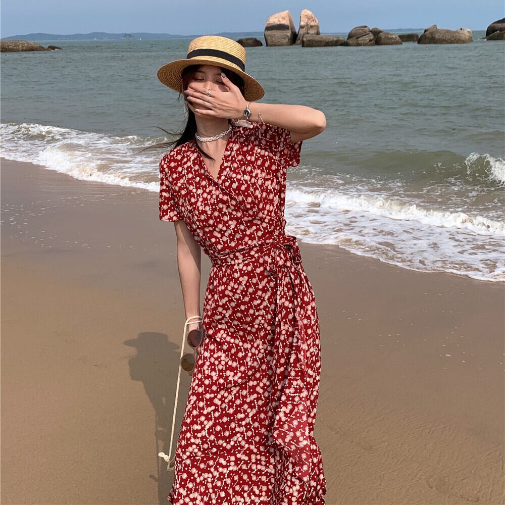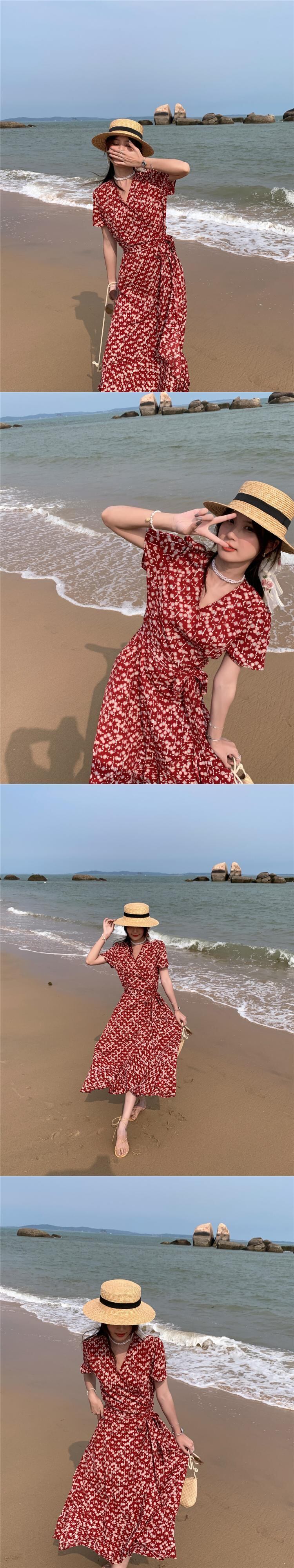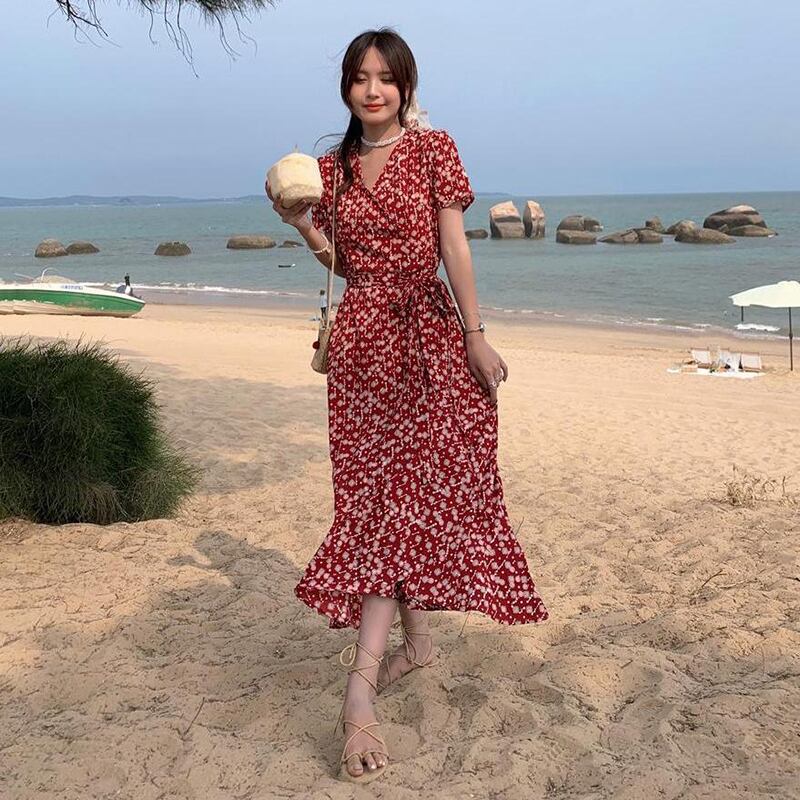 大きいサイズの婦人服 2022 ファット シスター夏の新しいフレンチ レースアップ ウエスト スリム フリル襟花柄ドレス 大きめサイズ サマー 夏物 8884157044409265