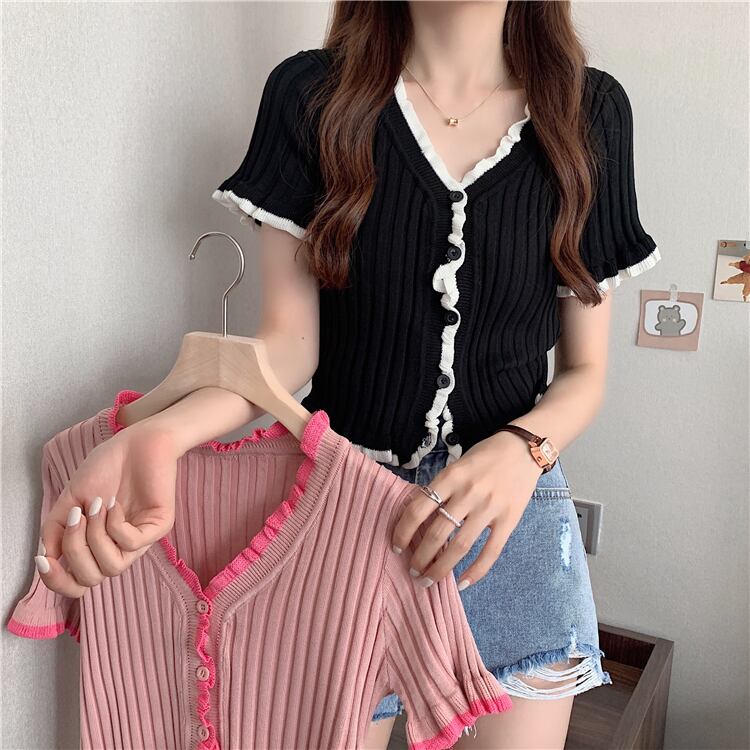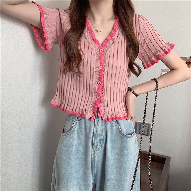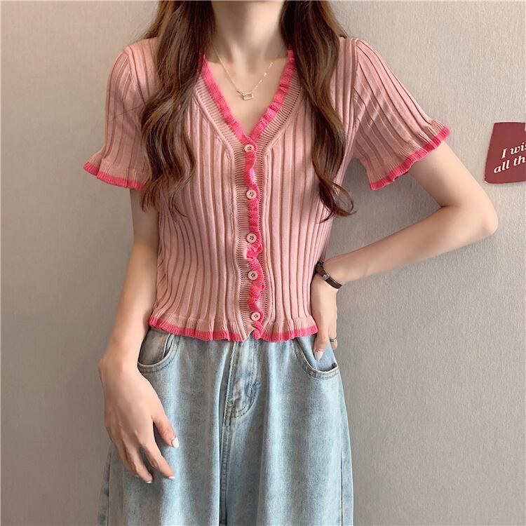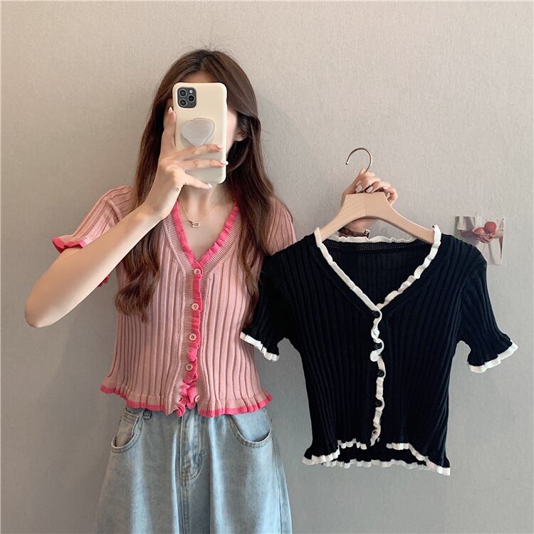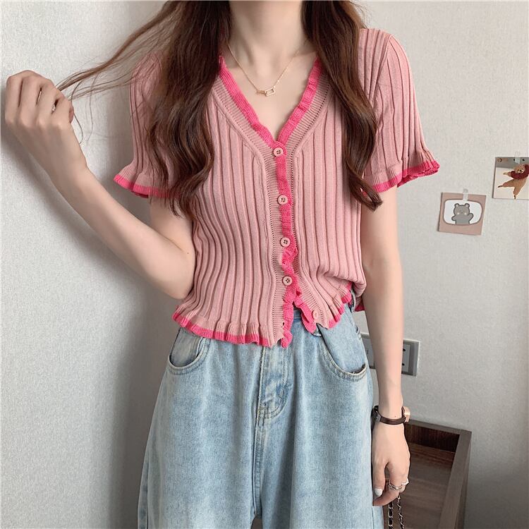大きいサイズの婦人服 2022 トレンディな女性の夏の新しいファット シスター ファッション コントラスト カラー菌エッジ V ネック オールマッチ ショート ニット セーター 大きめサイズ サマー 夏物 Vネック 8884189675232632
