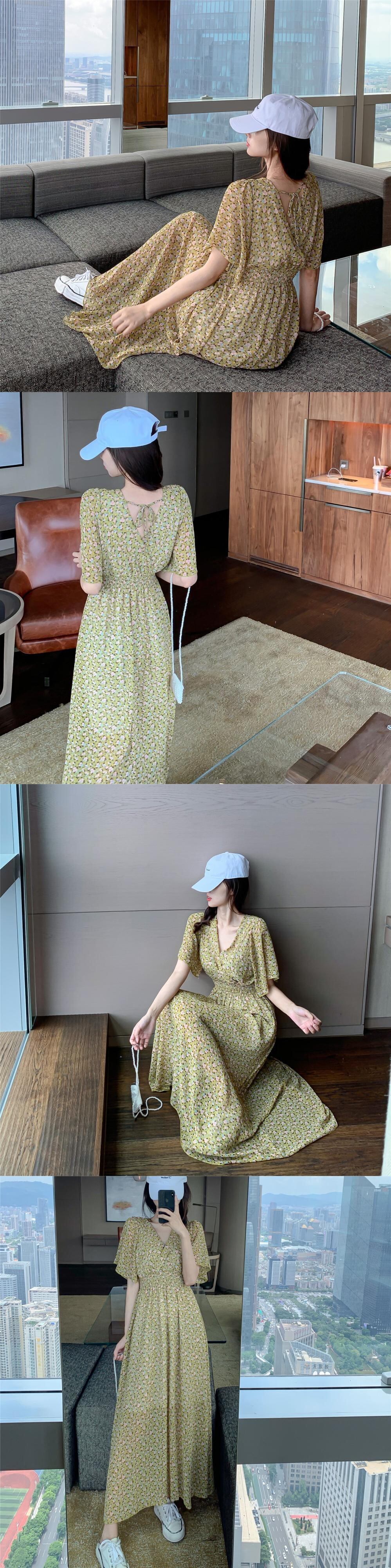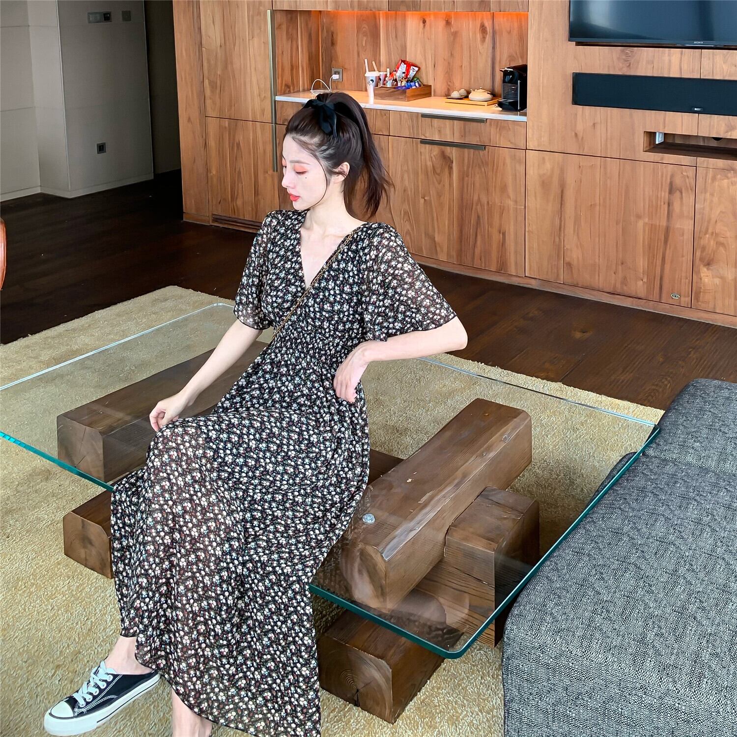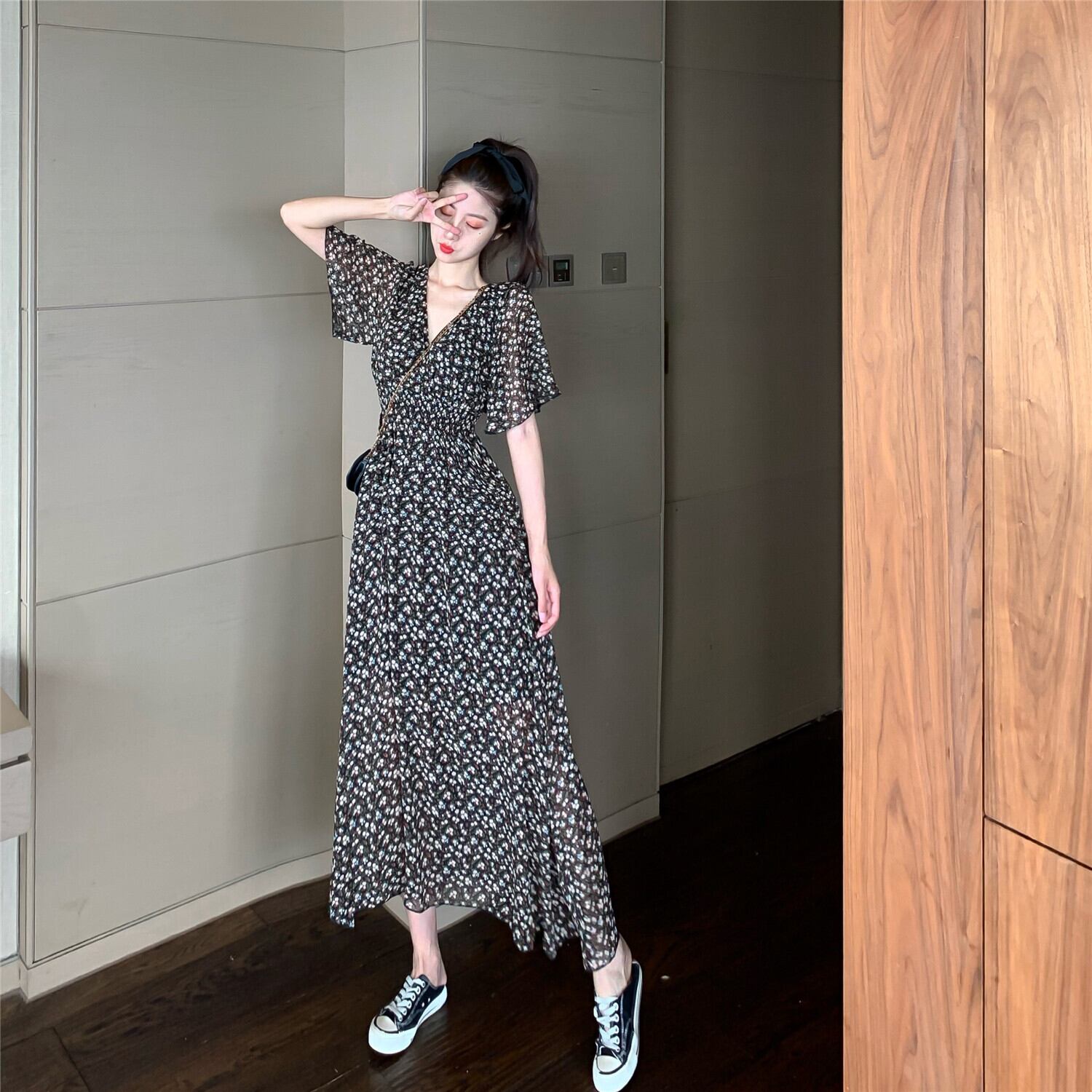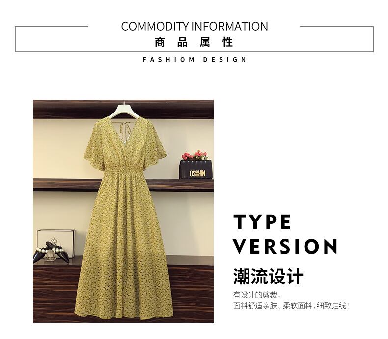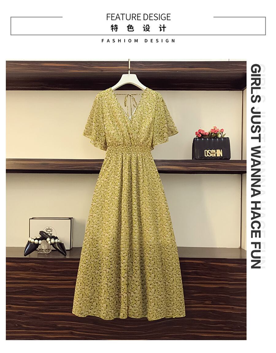 大きいサイズの婦人服 2022 ファット シスター夏の新しい洋風花柄シフォン膝上 V ネック スーパー フェアリー ドレス 大きめサイズ サマー 夏物 Vネック 8884121412094803