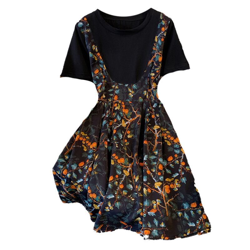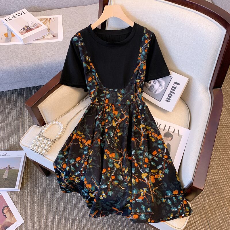 大サイズの婦人服 2022 夏の新しいファットシスターカジュアルウエストステッチフェイクツーピース花フレンチドレスの女性 大きめサイズ サマー 夏物 花柄 8884194569500416
