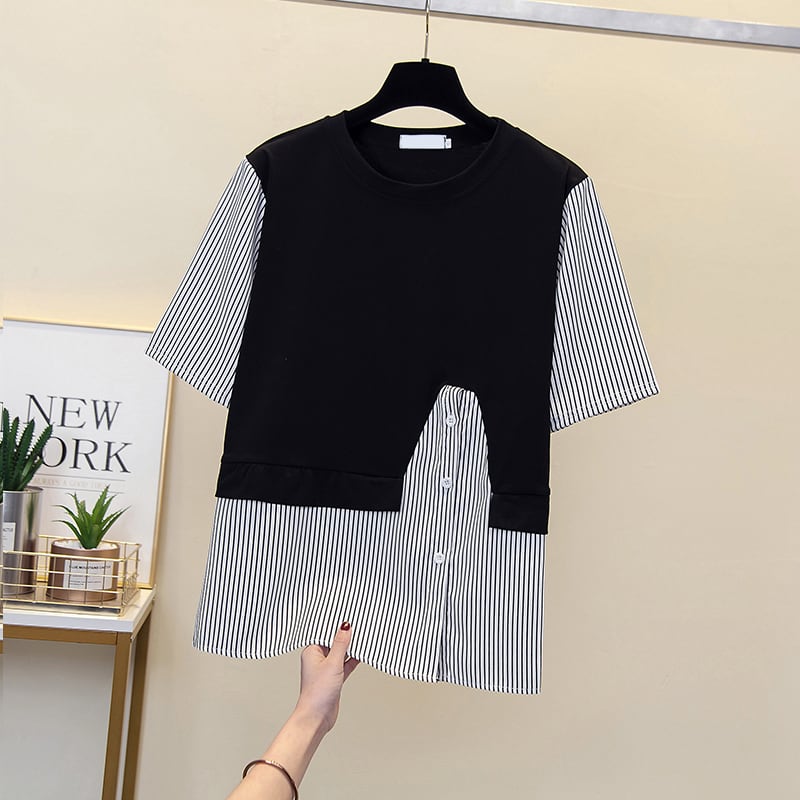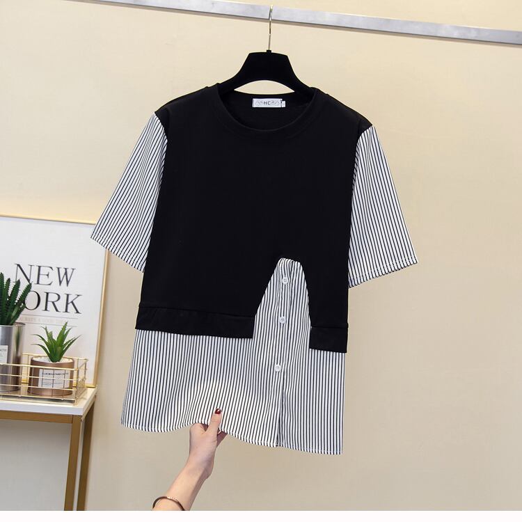 大きいサイズの婦人服 2022 夏新ファットシスター緩い肉カバーニッチストライプステッチ半袖フェイクツーピース Tシャツ 大きめサイズ サマー 夏物 8884174274695427
