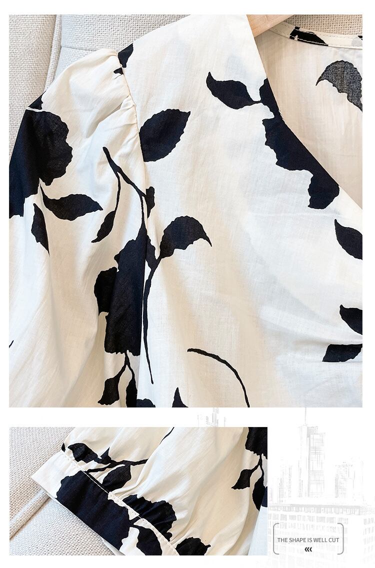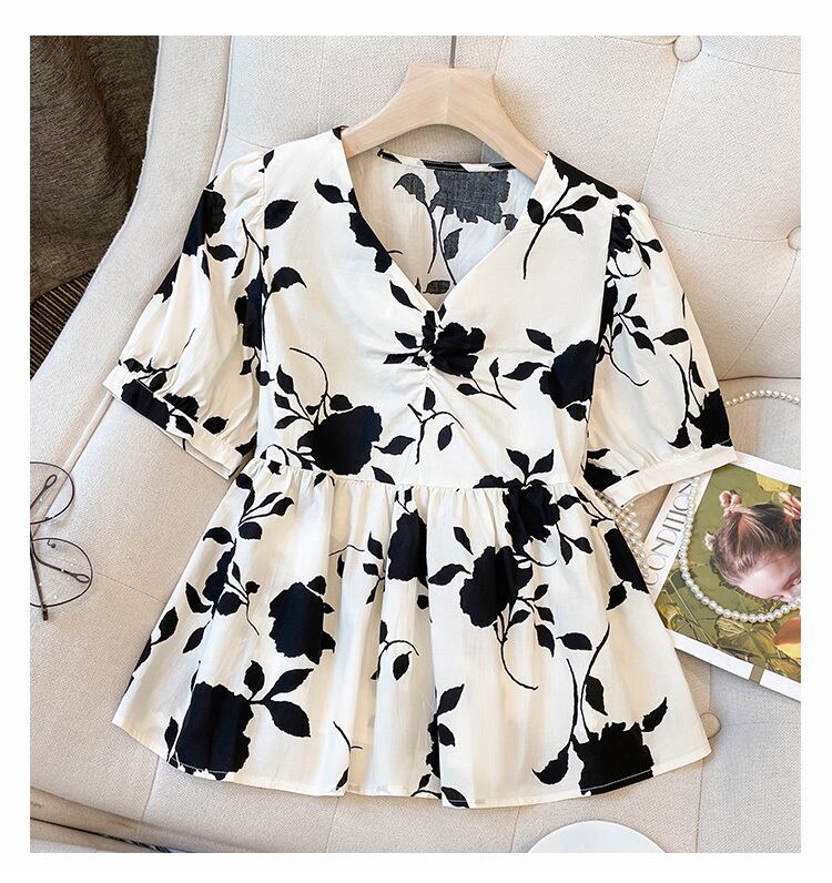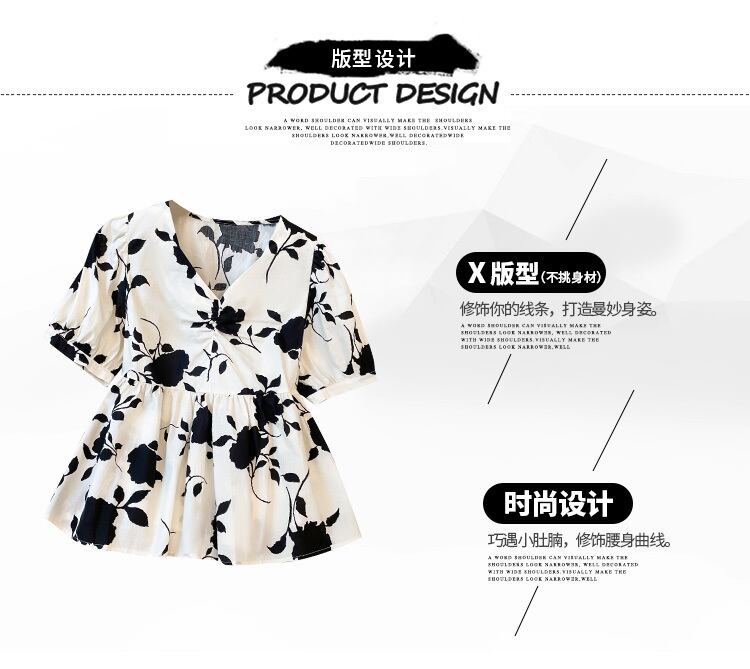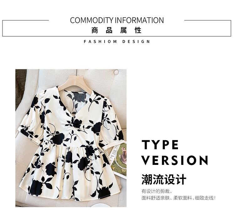 大きいサイズの婦人服 2022 ファットシスター夏の新しいフランスのレトロな花柄の薄いパフスリーブ V ネック半袖シャツ 大きめサイズ サマー 夏物 Vネック 888416186295986