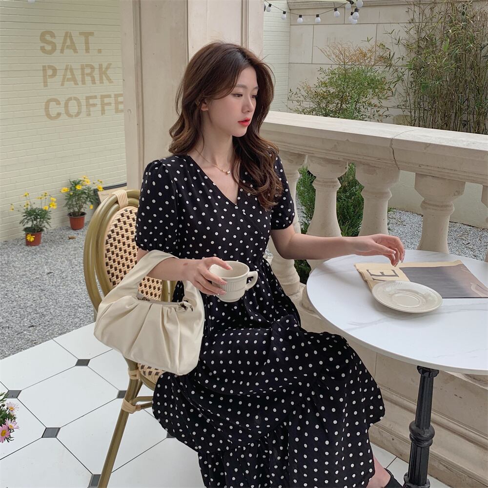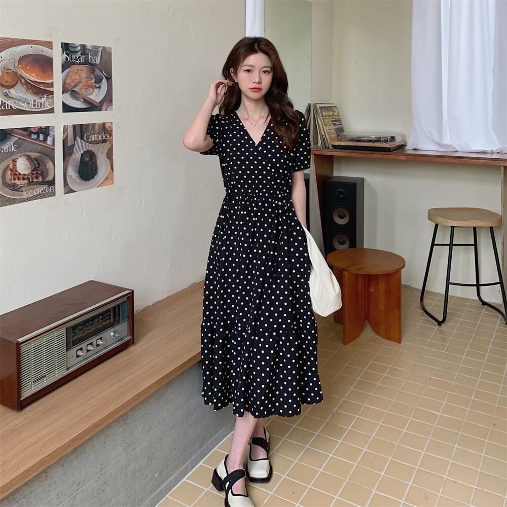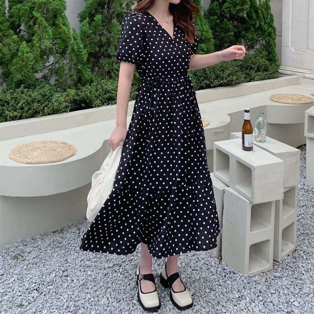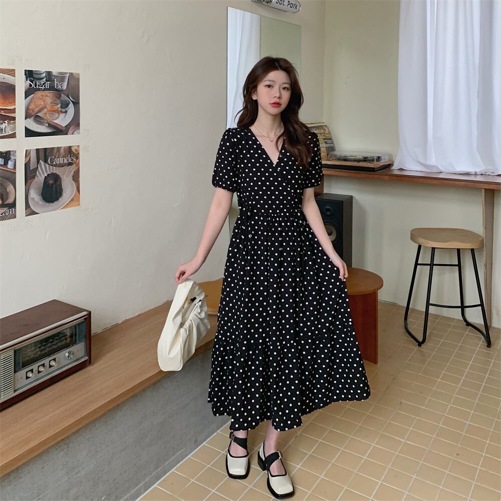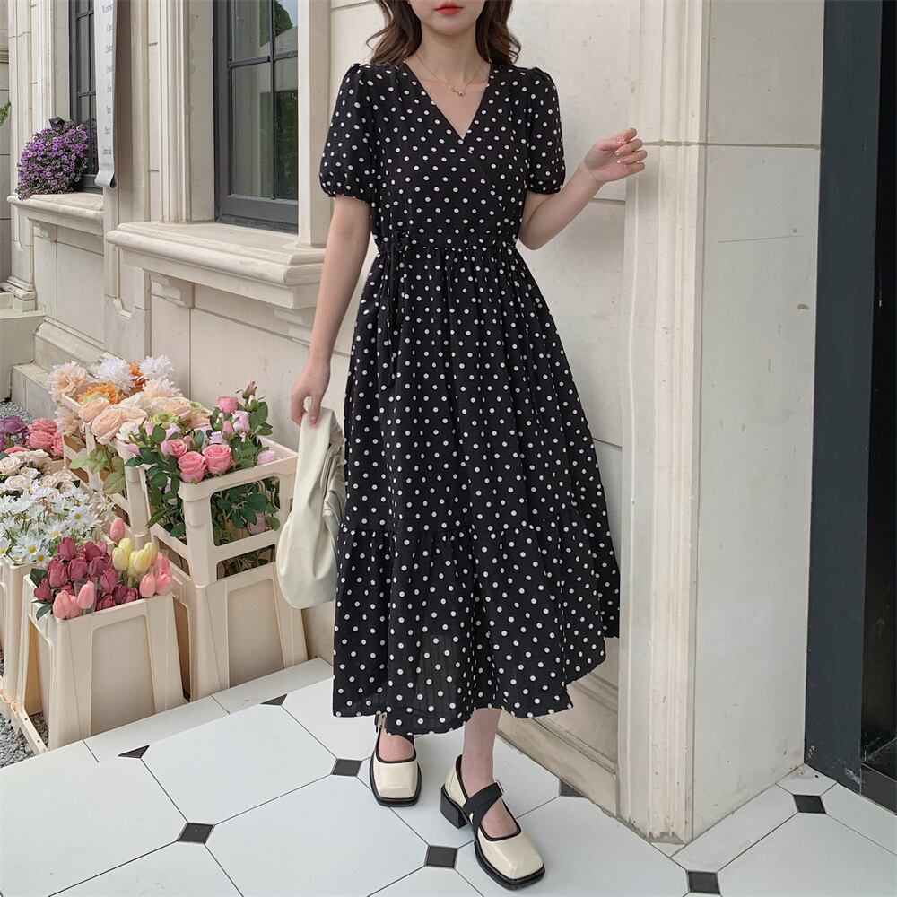 プラスサイズの婦人服 2022 ファットシスター夏の新しいフレンチ V ネック水玉レトロハイウエストシフォンロングドレス ハイウェスト 大きめサイズ サマー 夏物 Vネック 8884129777086120