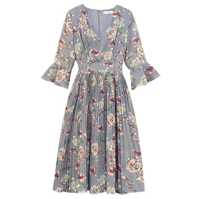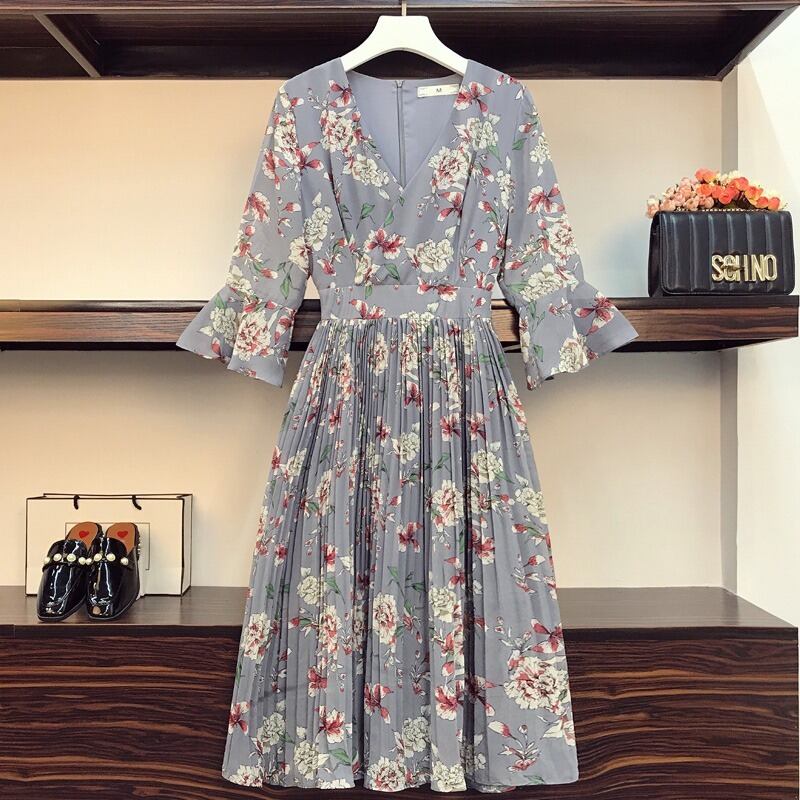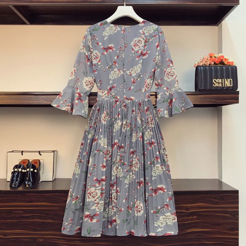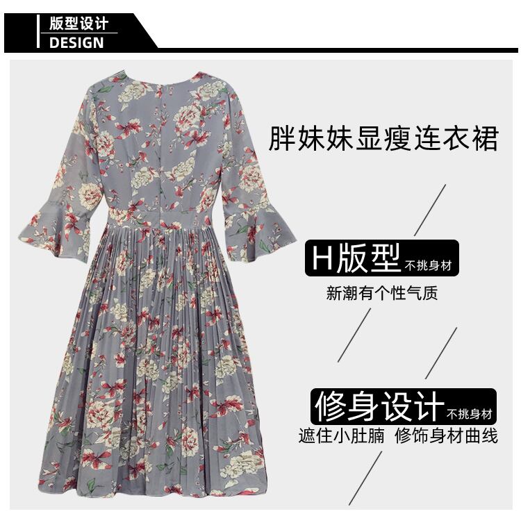 大きいサイズの婦人服 2022 トレンディな女性の夏の新しいファットシスタートランペットスリーブ V ネック膝丈オールマッチ気質ドレス 大きめサイズ サマー 夏物 Vネック 8884113306302580