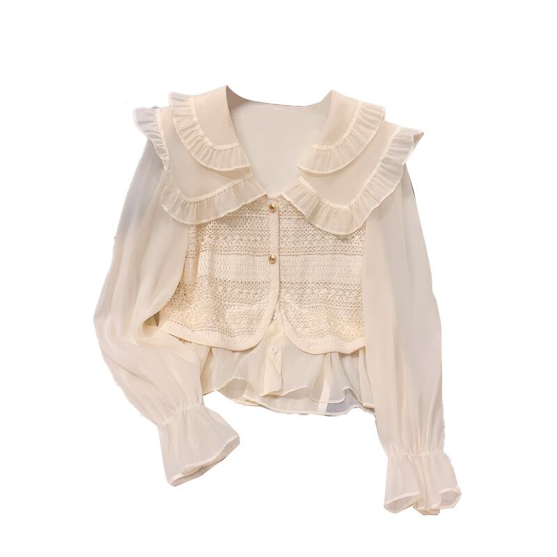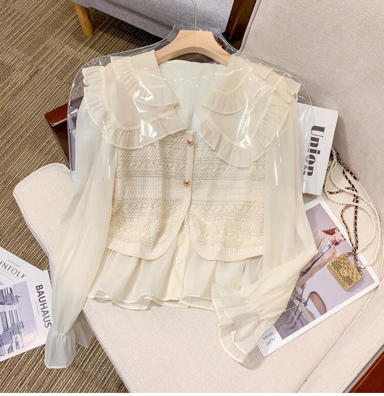 大サイズの婦人服 2022 ファットシスター秋の新スリムパフスリーブレーストップ甘い偽ツーピースシャツ女性 大きめサイズ 大人ガーリー スウィート キュート カジュアル オータム 秋物 888413456088322