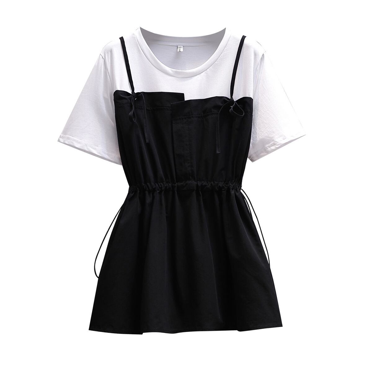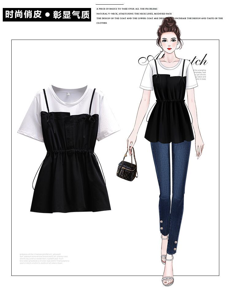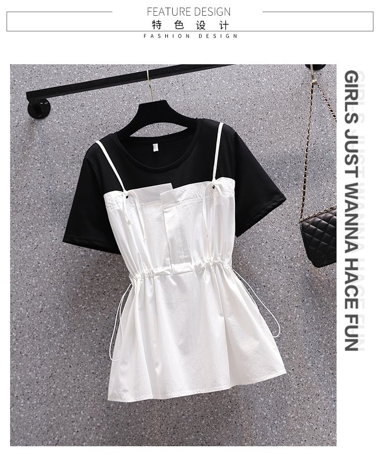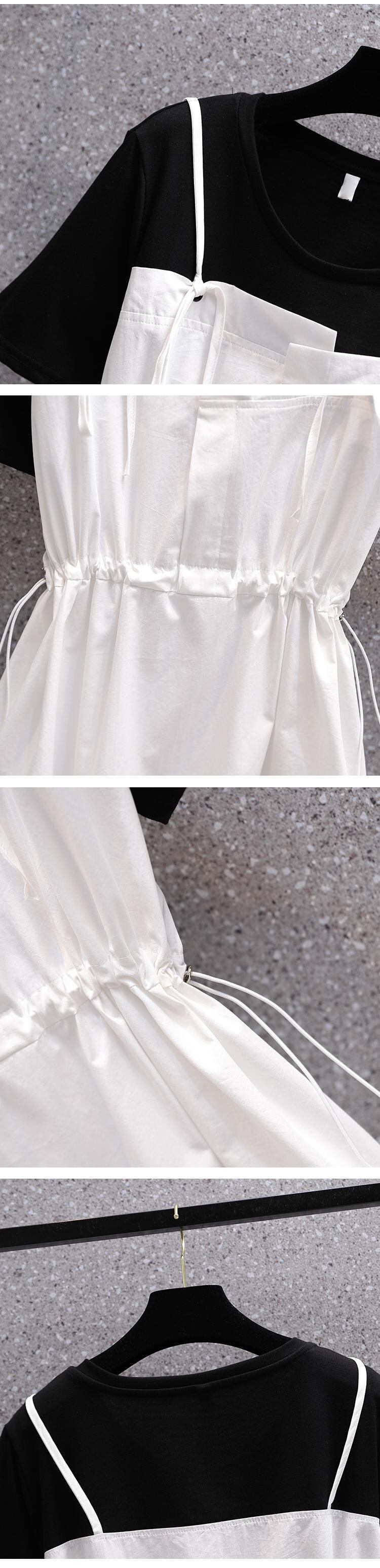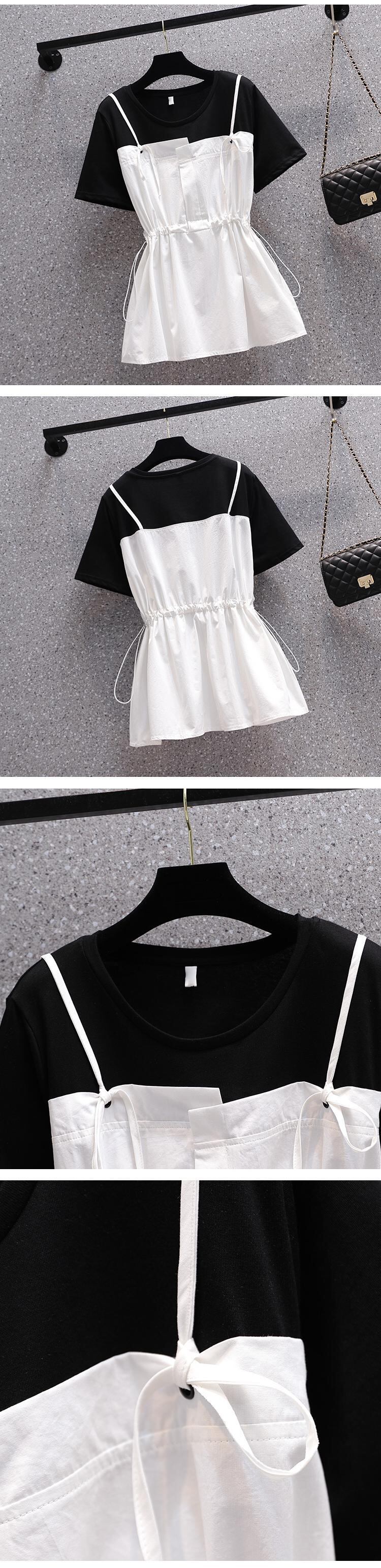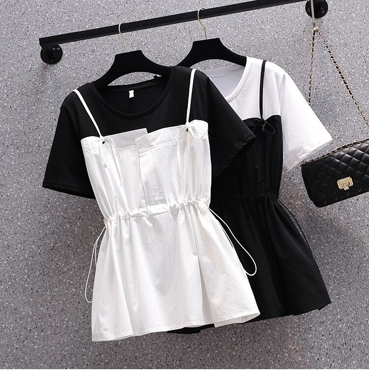 大きいサイズの婦人服2022夏の新しい太った姉妹の腰のような気質のカジュアルなスリムなネクタイの偽のツーピースのステッチのシャツ 大きめサイズ サマー 夏物 8884110746696941