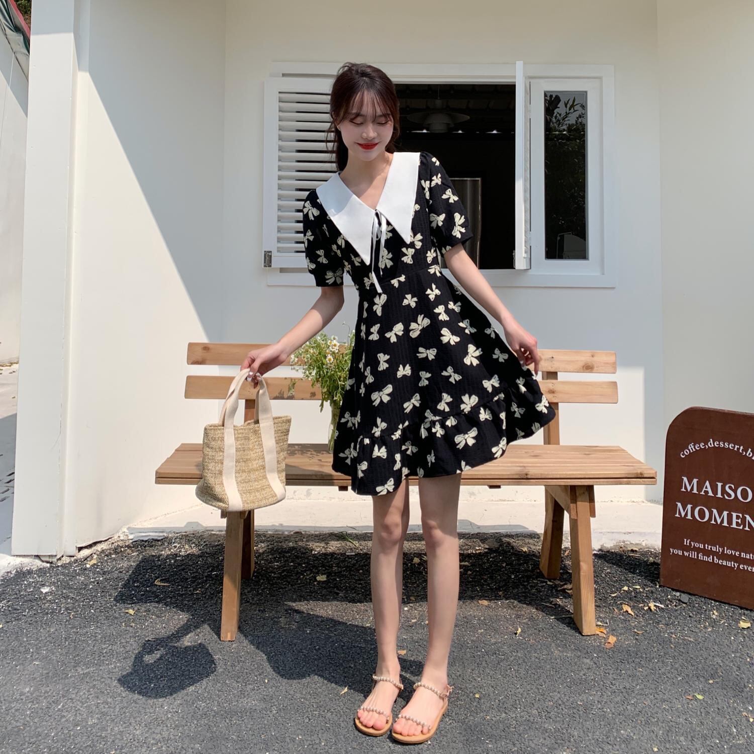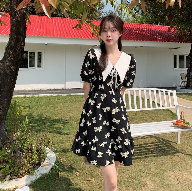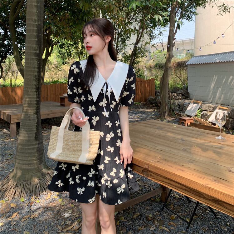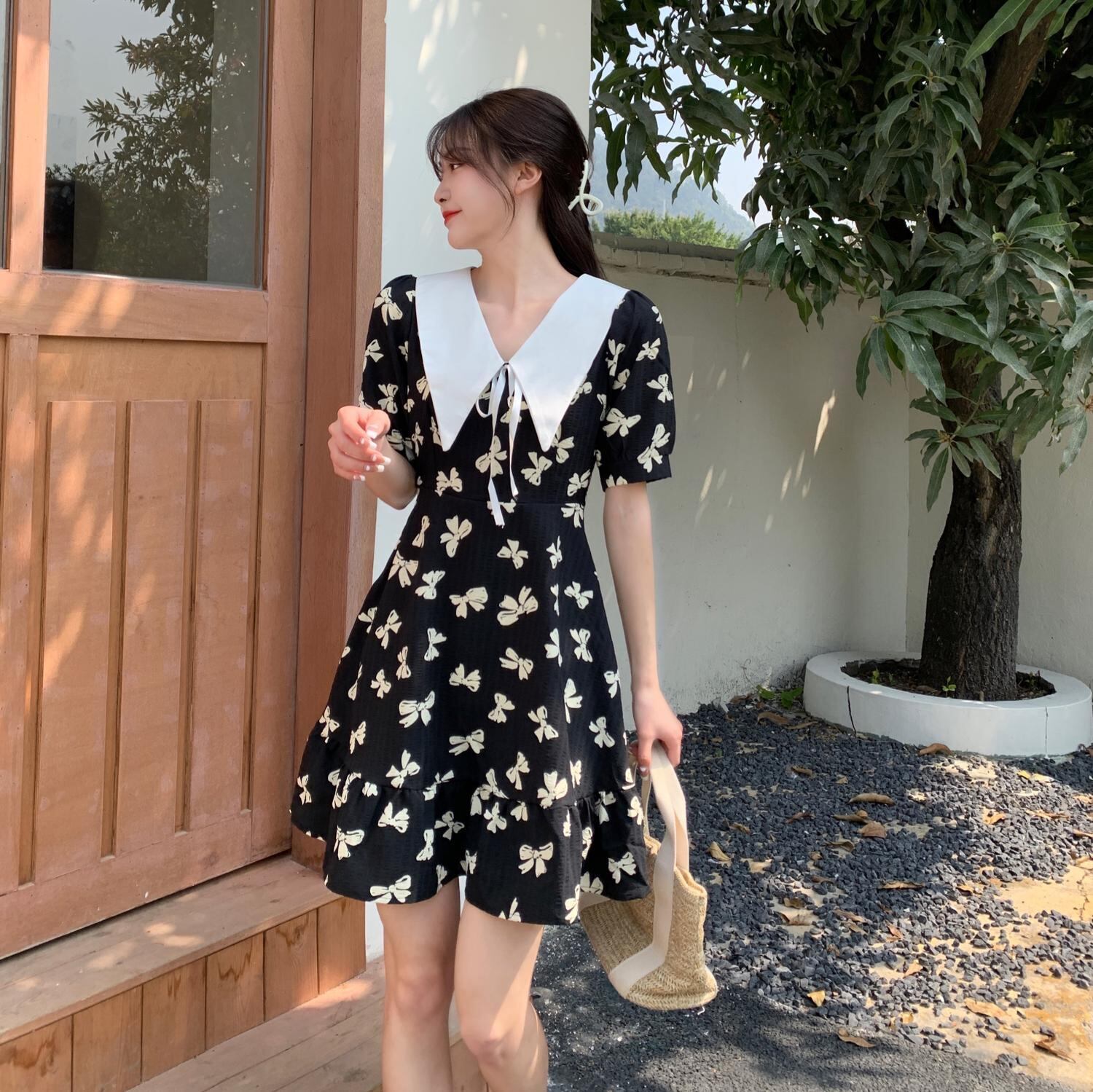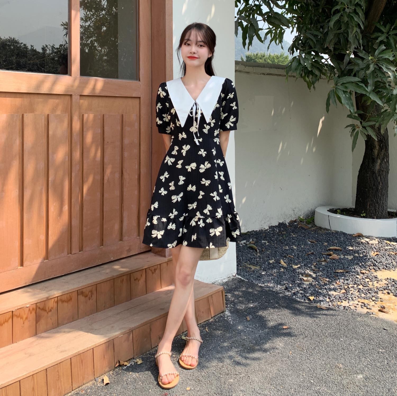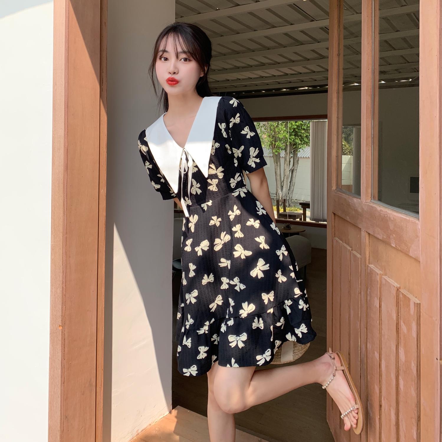 プラスサイズの婦人服2022ファットシスター夏の新しいスタイルのウエストと薄い気質の甘い対照的なラペルプリントドレス 大きめサイズ 大人ガーリー スウィート キュート カジュアル サマー 夏物 8884137464479709