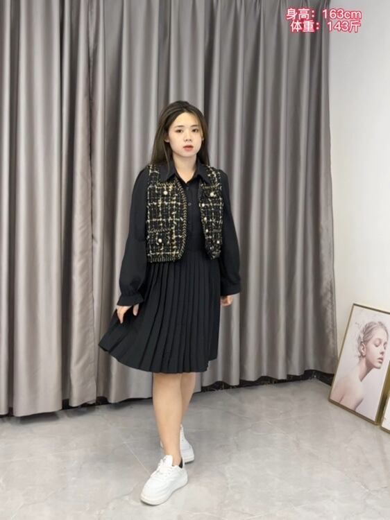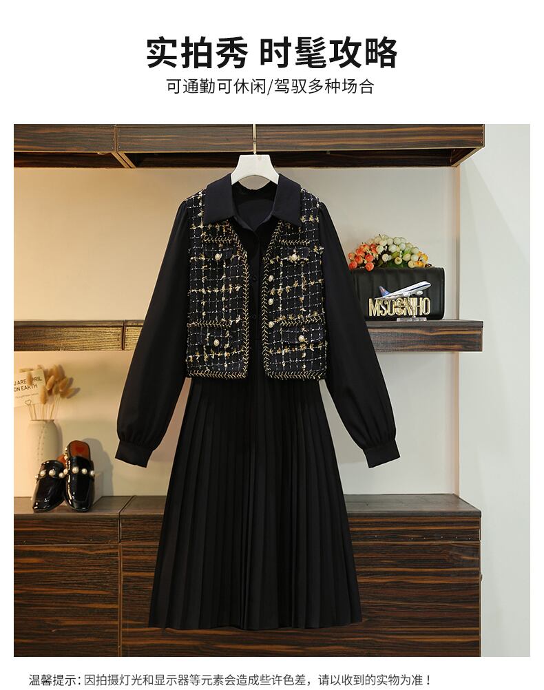 大きいサイズ 婦人服 2022年 ファットシスター 秋 新作 洋風 老化防止 ベスト シャツ プリーツワンピース 2点セット 大きめサイズ オータム 秋物 888414720574944