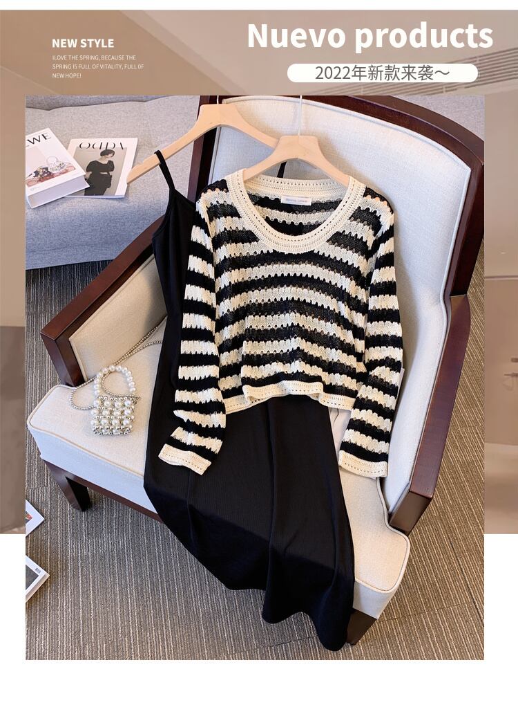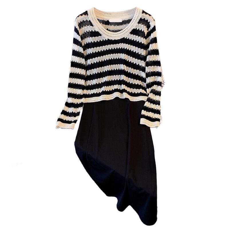 大サイズの女性の 2022 秋の新脂肪姉妹ストライプ底入れニットセーターウエストサスペンダードレスツーピース 大きめサイズ オータム 秋物 888417363558279