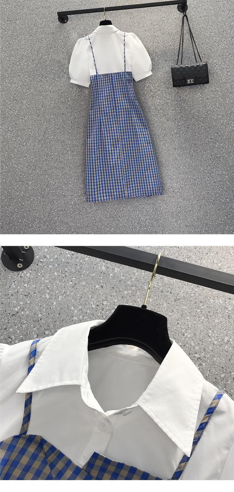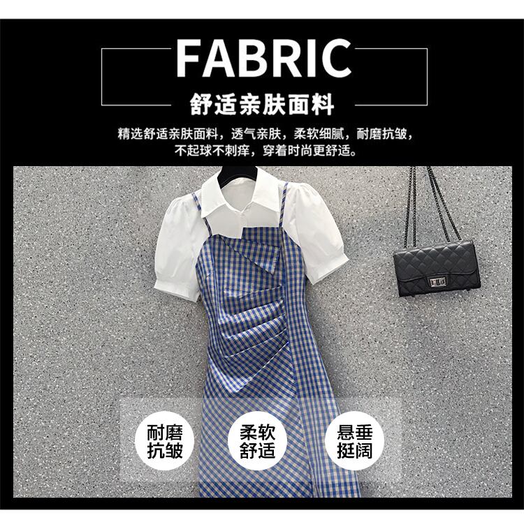 大きいサイズの婦人服 2022 ファットシスター夏の新ファッションフェイクツーピーススリムチェック柄ステッチ半袖ドレス 大きめサイズ サマー 夏物 8884142978547573