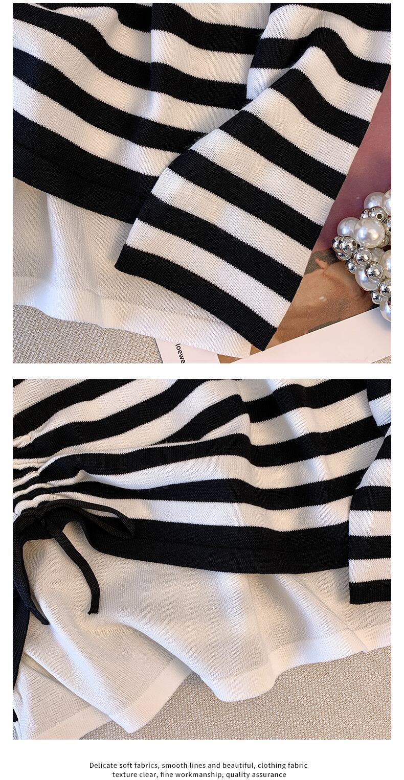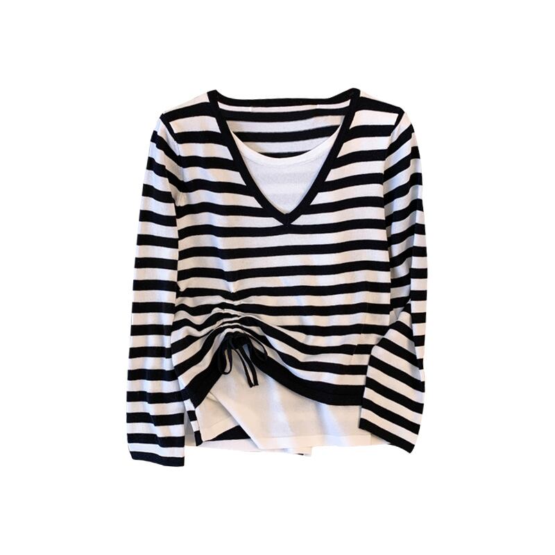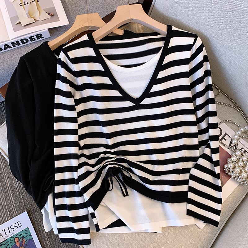 大サイズの婦人服 2022 秋の新ファットシスターオールマッチステッチストライプフェイクツーピース v ネックファッションセーター女性 大きめサイズ オータム 秋物 Vネック 8884191006095246