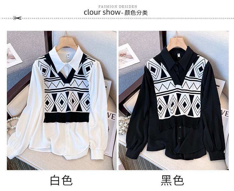 大きいサイズの婦人服 2022 トレンディな女性の秋の新しいファットシスターファッションステッチニットフェイクツーピースの肉を覆う薄いシャツ 大きめサイズ オータム 秋物 8884199941813875
