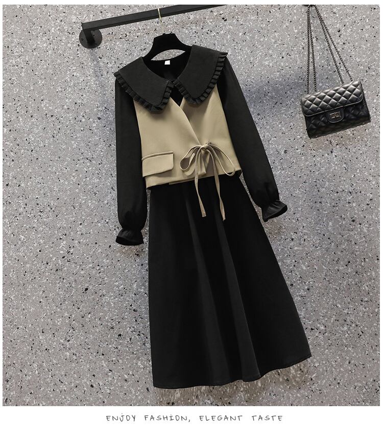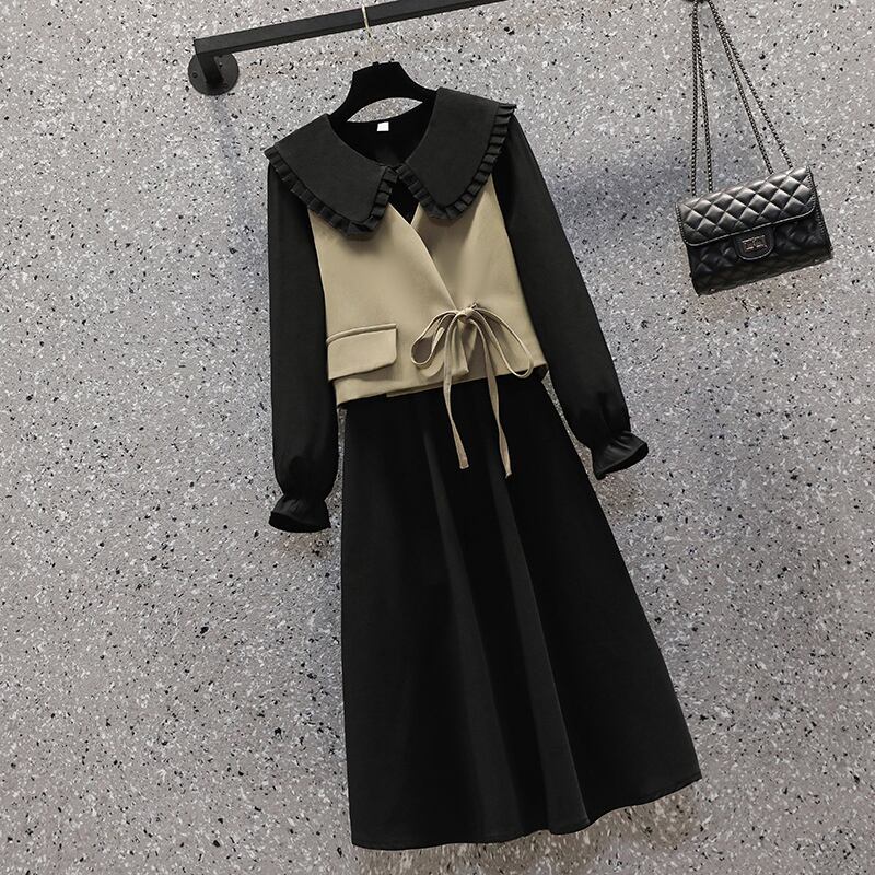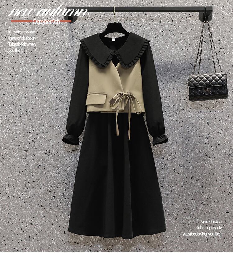 大きいサイズの婦人服 2022 ファットシスター秋の新しいスタイルの西洋スタイルのスリムな人形の襟のドレスファッションベスト 2 点セット 大きめサイズ オータム 秋物 888414499853567
