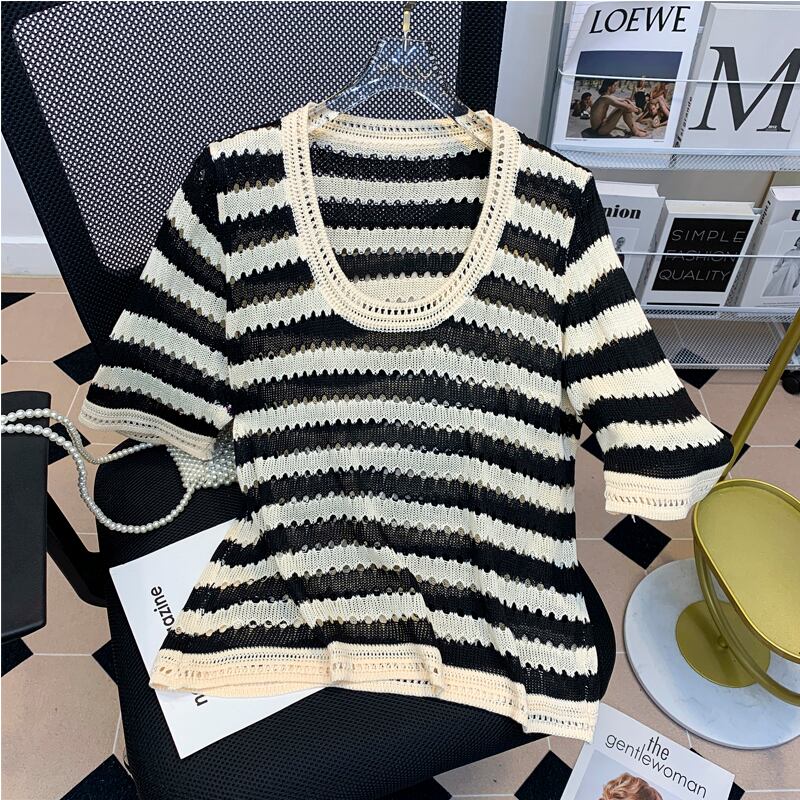 大きいサイズの婦人服 2022 ファットシスター夏の新しいレトロなコントラストカラー中空ルーズストライプ半袖ニットトップレディース 大きめサイズ サマー 夏物 8884158467255107