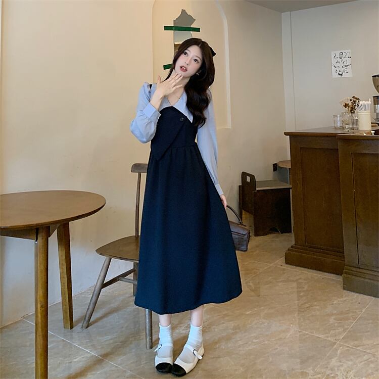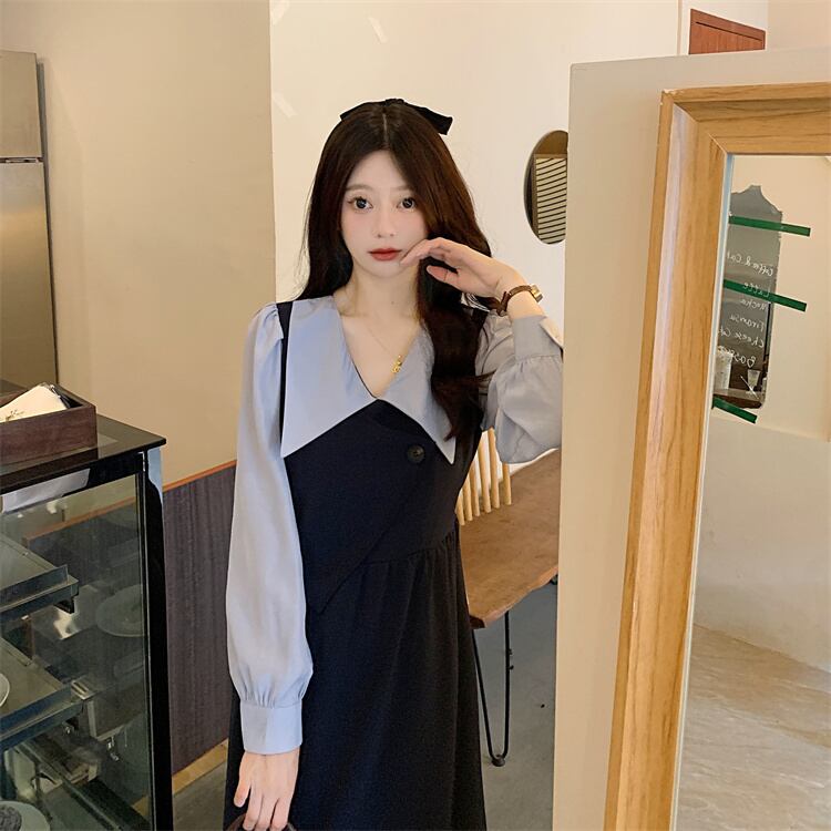 大きいサイズの婦人服 2022 ファットシスター秋の新しい偽のツーピースの気質のウエストと薄い人形の襟の長袖のドレス ロング 大きめサイズ オータム 秋物 8884165121786243