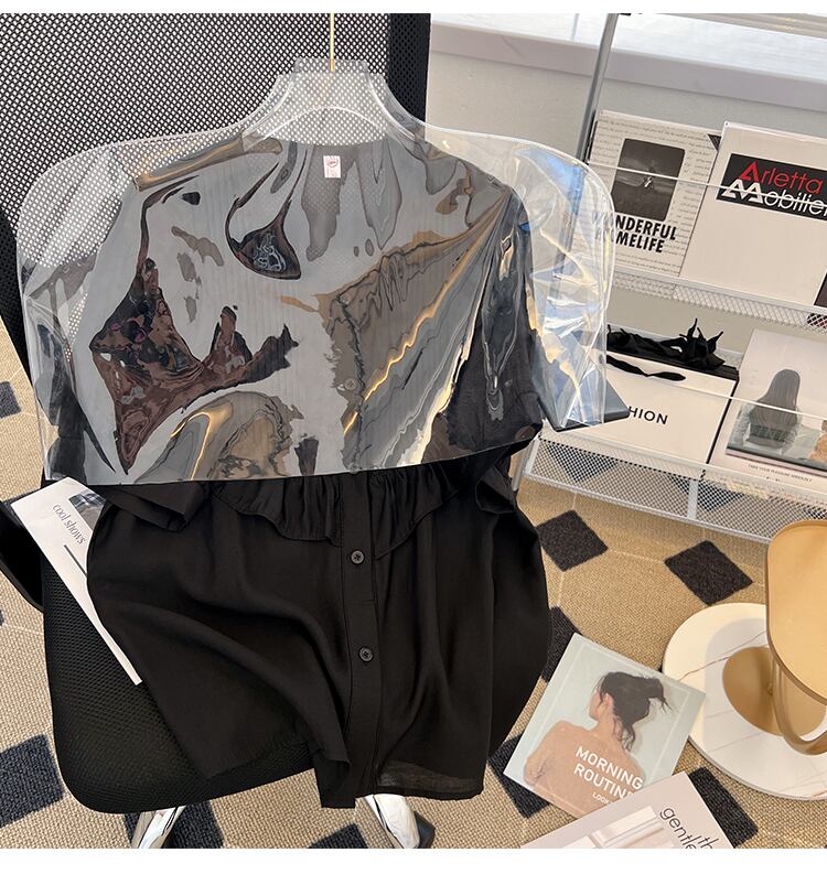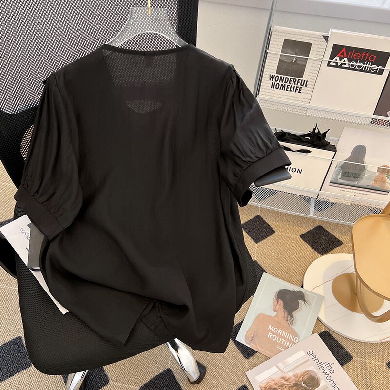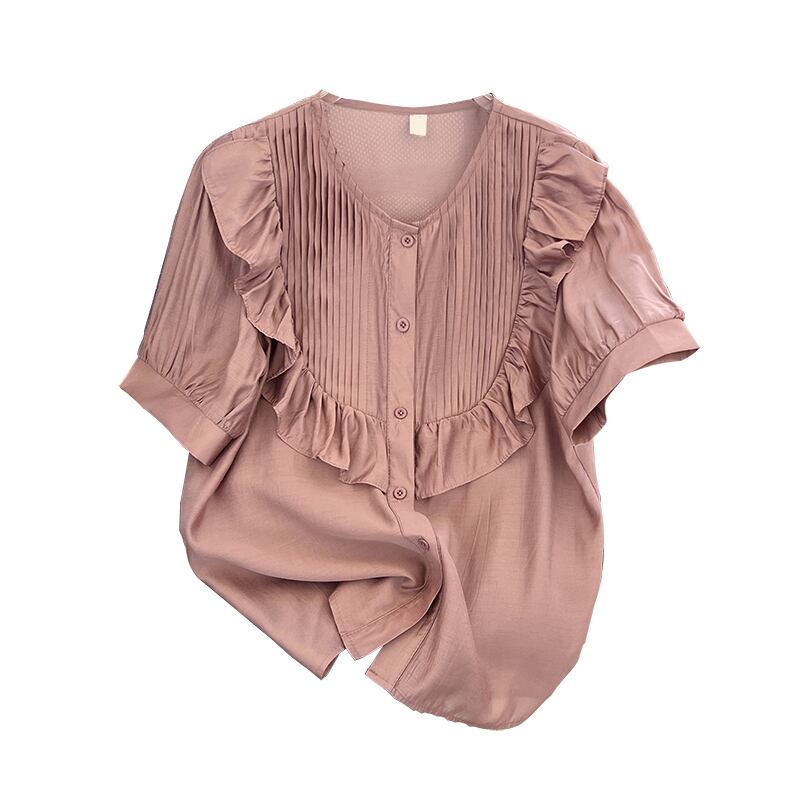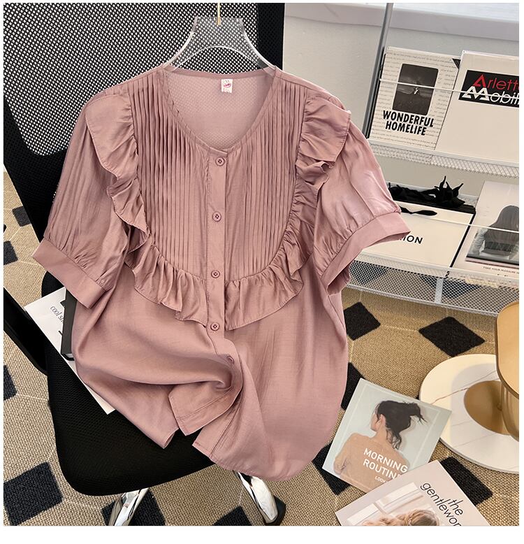 大きいサイズの婦人服 2022 ファットシスター夏の新しいフリル eign エア Tensil 小さいシャツ無地シャツ半袖トップ 大きめサイズ サマー 夏物 ソリッドカラー 8884139346799599