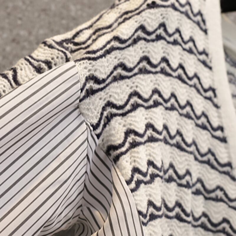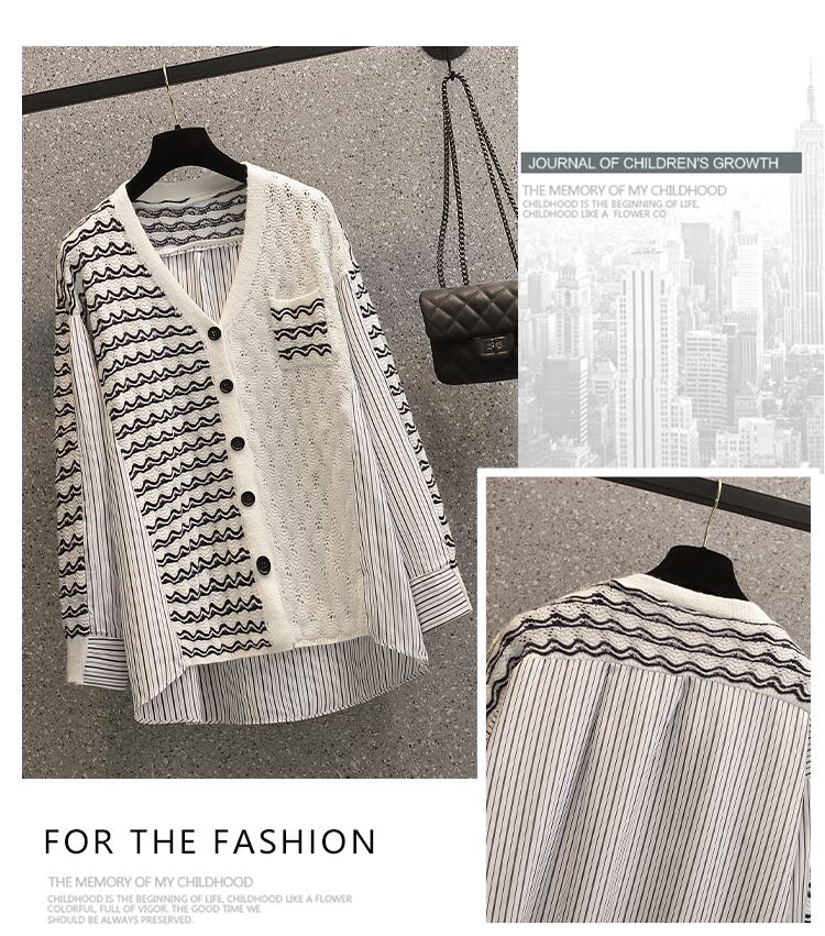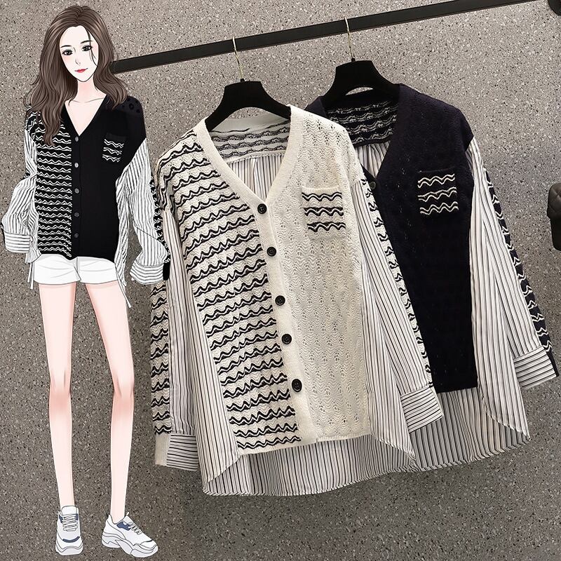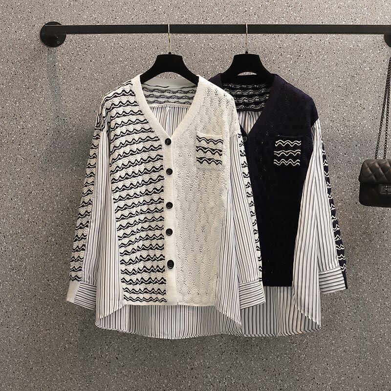 大きいサイズの婦人服 2022 トレンディな女性の秋の新しいファットシスターフレンチ気質ストライプ薄いカジュアルルーズニットシャツ 大きめサイズ オータム 秋物 8884169141476978